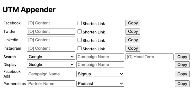 UTM Appender is a Chrome extension to capture the URL of the page you are at and append UTM tags for different platforms. The way it is by default is somewhat opinionated by you can adapt the code to fit your needs.