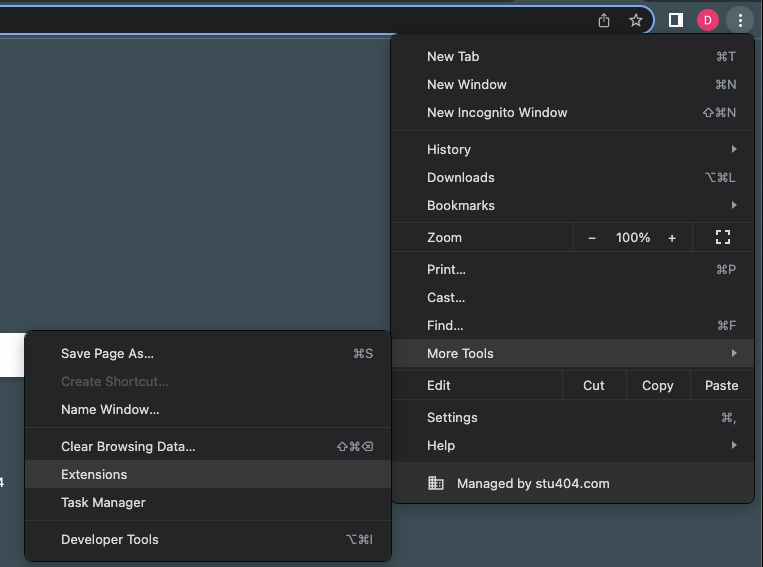 Click the 3 dots in the upper right corner of your Chrome window and navigate to 'More Tools' > 'Extensions'