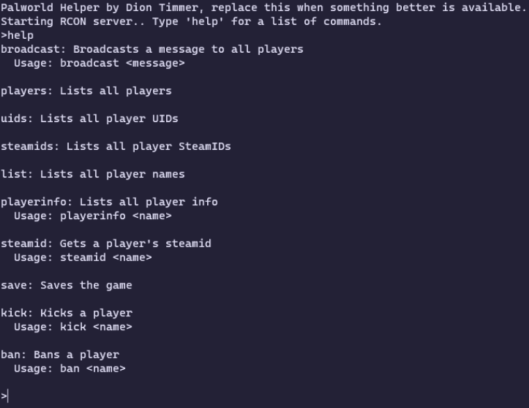 A basic Python wrapper for RCON, designed to facilitate server management for PalWorld servers. It offers preliminary support for player join/leave messages, albeit with some limitations. This tool is intended as a temporary solution until a more robust system is developed.