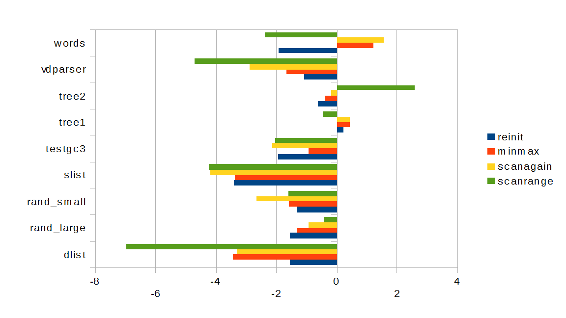 Benchmarks are not very stable, but show an improvement of 1 to 5 %. The graph shows the incremental performance change from bottom to top in percent, unfortunately not in the order of the commits:
