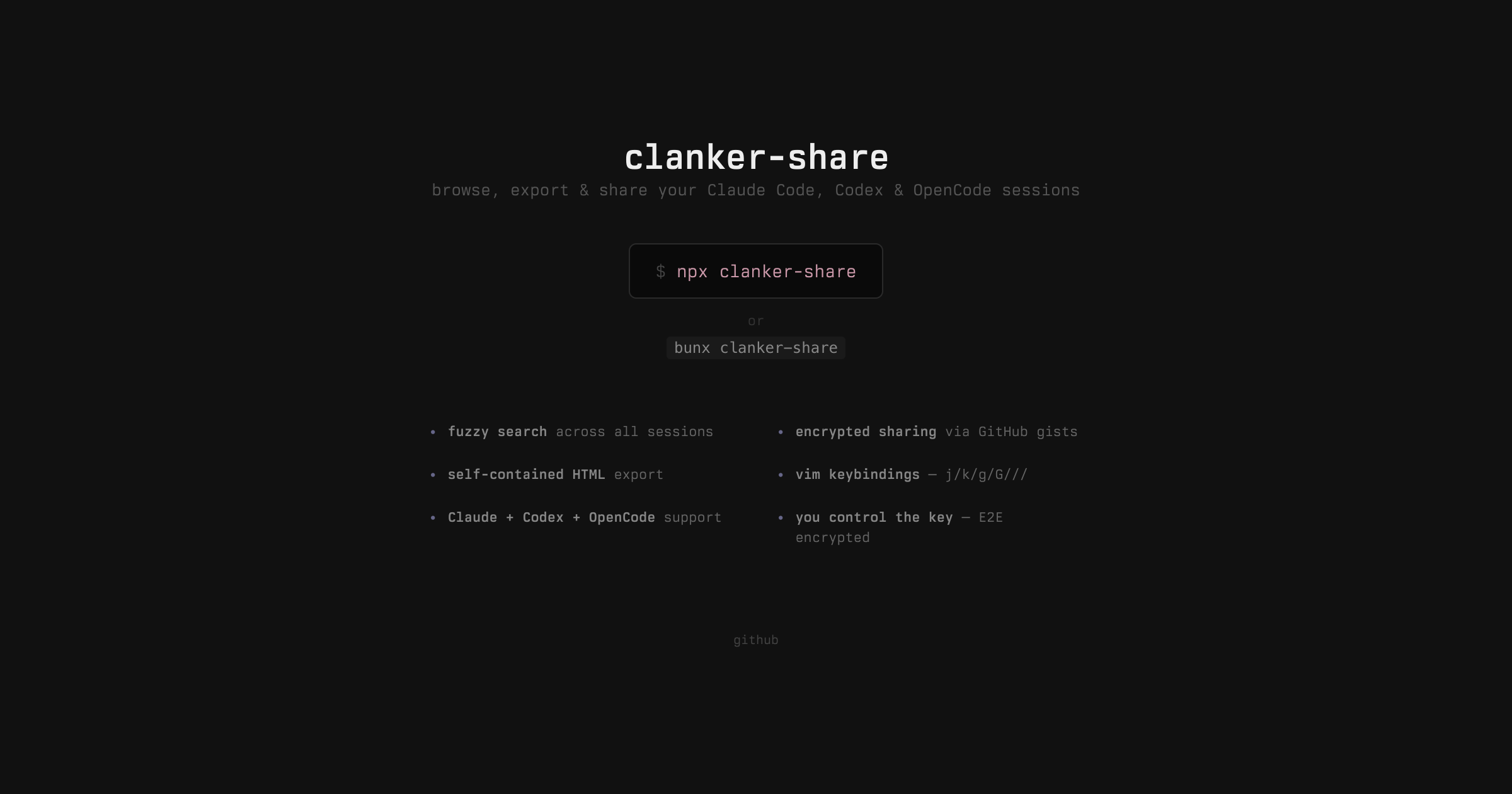 when you press s, the session gets compressed, encrypted with a random key, and uploaded as a GitHub gist. the private URL (with the key in the fragment) is copied to your clipboard. the key never hits any server — decryption happens entirely in the browser at share.clanker.monster.