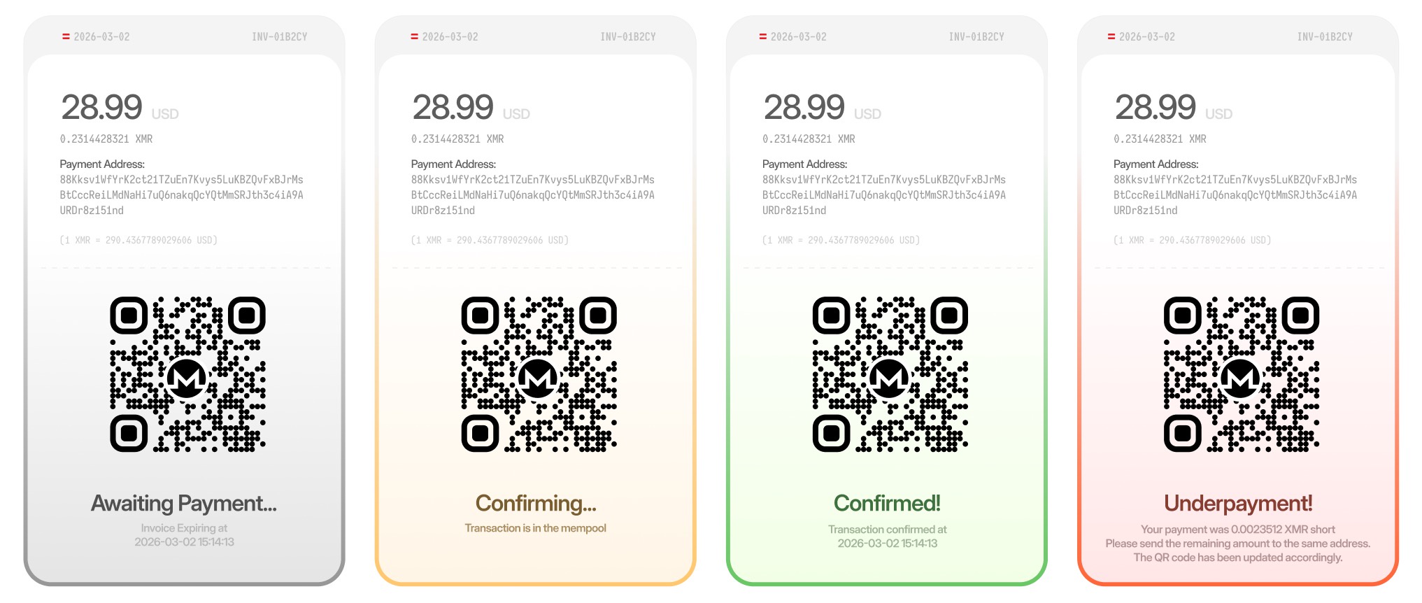 - Underpayment Handling: If a customer sends too little XMR, the widget automatically detects it, updates the QR code to show the remaining balance, and waits for the difference.