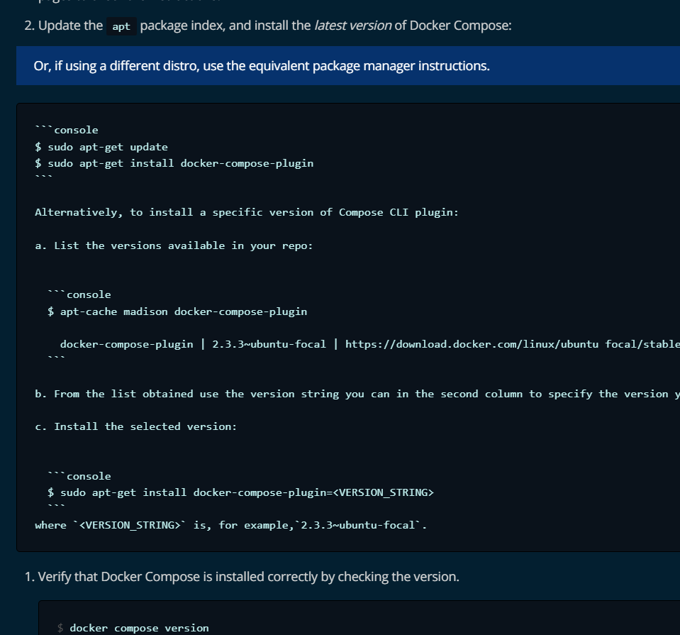 This doesn't look good at all. The Compose plugin installation instructions are now a mess: it's a very long page with numbered lists, the numbering is sometimes even incorrect, subheaders are missing, the very easy tabs are suddenly gone, there is a code block where the instructions are suddenly in the code (clearly syntax error). I would suggest to revert this change and fix it first.