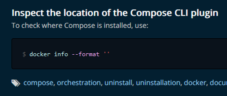 Looking at this page https://docs.docker.com/compose/install/uninstall/#inspect-the-location-of-the-compose-cli-plugin, format is indeed broken: