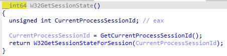 W32GetSessionState() is getting the session id for the calling threads process, then uses this to get the session state.