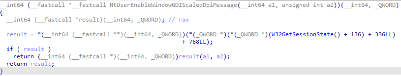 Win32k functions now look like this. The assembly is quite convulted so its easier to look at a reconstructed version in C.
