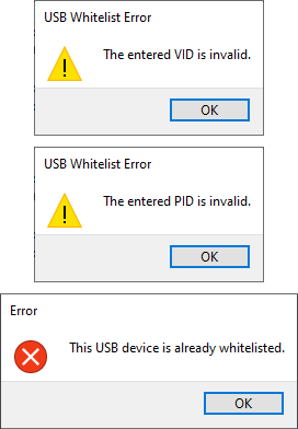 Made all validation popups use the same window title and same alert type. It was a bit strange and inconsistent having a warning type popup named "USB Whitelist Error"