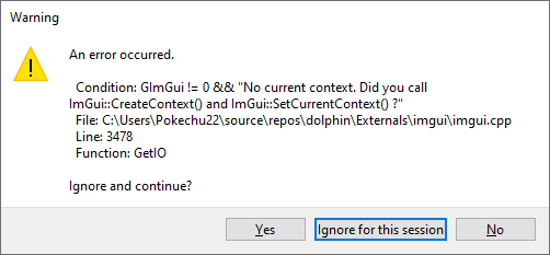 ASSERTmacro for theIM_ASSERTmacro. This does mean imgui now depends on both common and fmt, but since imgui is only used by dolphinqt (and the cmakelists file is added by dolphin in the first place), I don't think this is a problem. In my opinion, it's better to use the same assert window for everything, rather than have the default assert/retry/ignore one appear sometimes.Examples by removing the call to