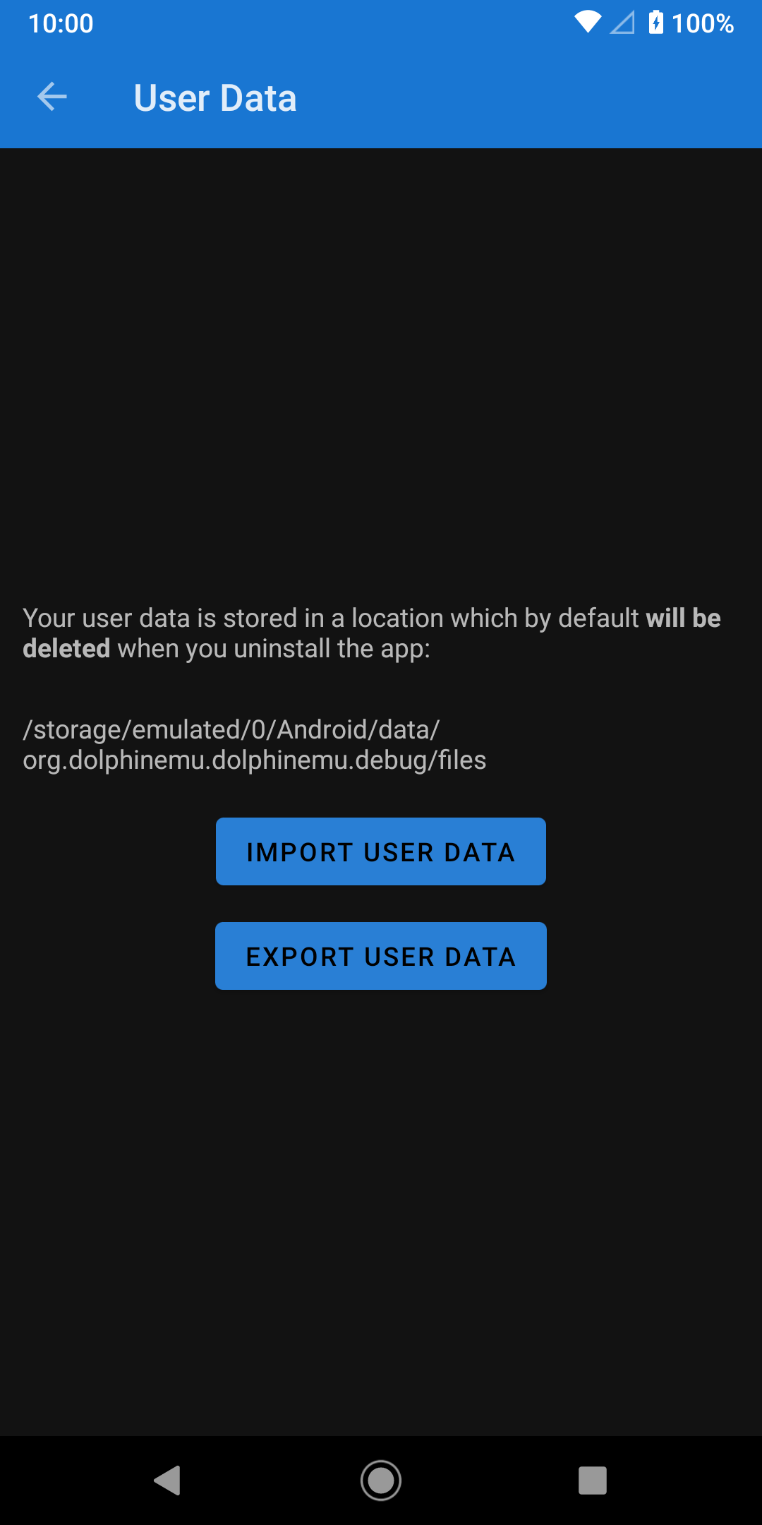 Apparently there are phones where accessing Dolphin's app-specific directory isn't just annoyingly hard but actually impossible. To give users of those phones at least some kind of way to manage their data (even if it's a lot less convenient than if we were allowed to let the user open the app-specific directory in a file manager), I'm adding a way to export the directory to a zip file and then import it back.