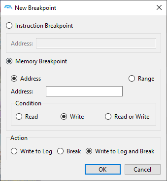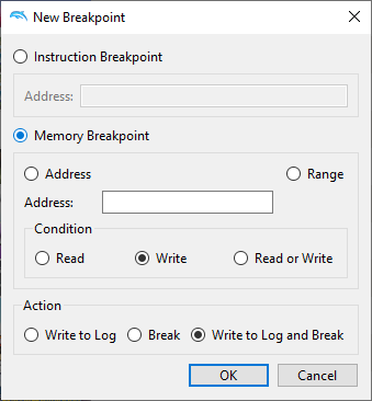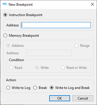 Open the breakpoints tab by selecting View → Breakpoints (the debugging UI may need to be enabled). Then, while a game is running, select "New". Then, click on the "Memory breakpoint" button 4 times. Weird stuff happens.