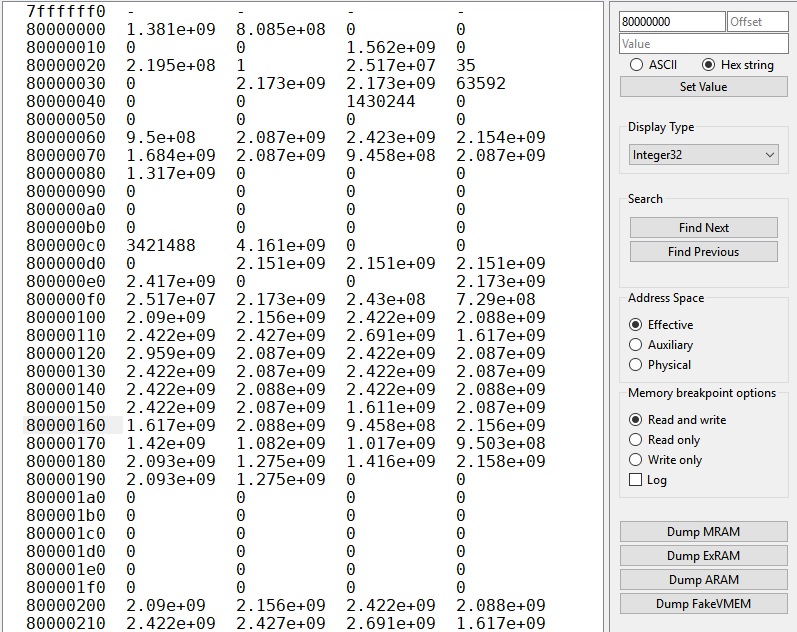 @AdmiralCurtiss I need your thoughts on how the rows should be aligned if you input 80000001 or 80000002. Keep in mind integer values change if the alignment isn't a multiple of the underlying byte length. The easy thing to do is forcibly round the row addresses to 0 at all times and just highlight the target address so you know where to look, but I'm thinking you need more functionality than that. 4 byte and 8 byte row lengths would of course if you rows aligned like that: Like 80000000, 80000004, 80000008 for byte. |