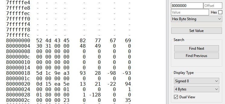 Looking for input on how customizable it should be. Currently it's always 4 bytes per row and the left side is always hex. It auto chooses the size/columns based on what is on the right. The second display type box, for bytes per row, doesn't do anything in dual view, because it's always 4 bytes or 8 bytes for a double.