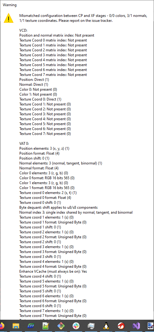 I've also added a check that the CP and XF matrix index registers match, since it's weird that they are duplicated (we currently always use the CP one with the hardware backends, and the XF one for the software renderer), and the XF input vertex spec register doesn't include a count for matrix indices (so if per-vertex matrix indices are enabled, it's not clear how XF knows which ones are in use).