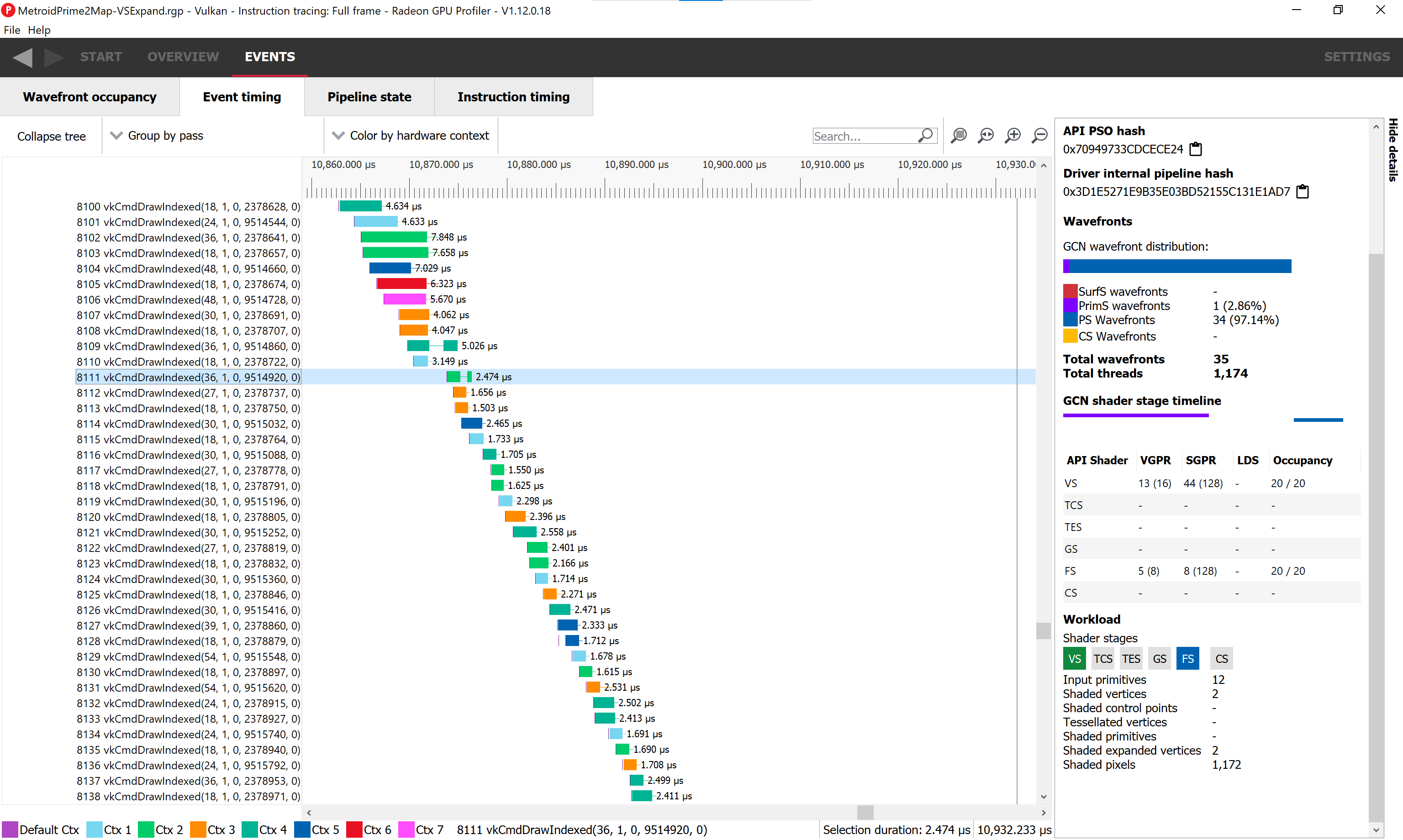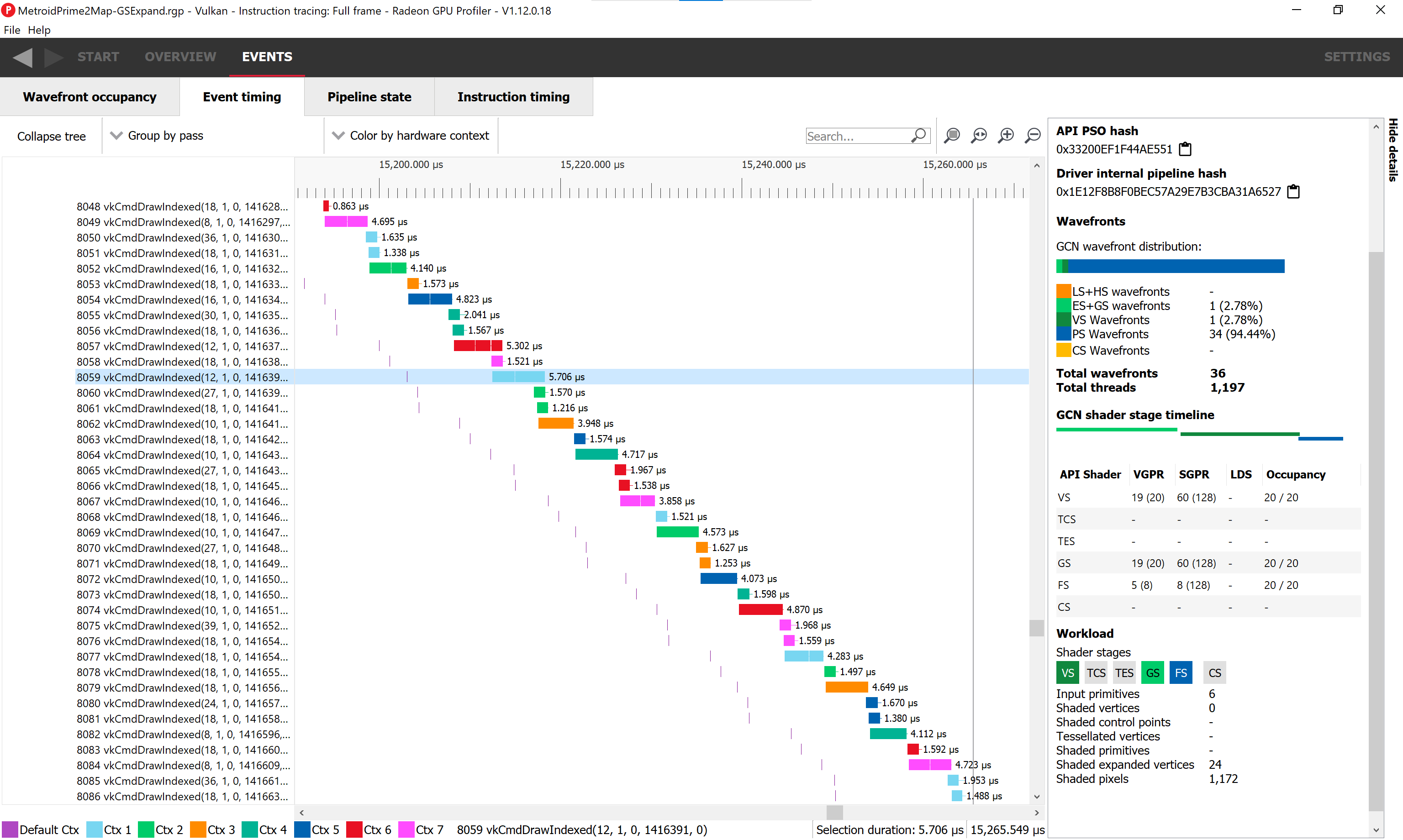 The VS expand one seems limited by how quickly the command processor can queue up work, which is mostly limited by the large number of context rolls (caused by pipeline changes). On the other hand, in GS expand, work is being queued way earlier than executed. Something somewhere else in the GPU is delaying execution.