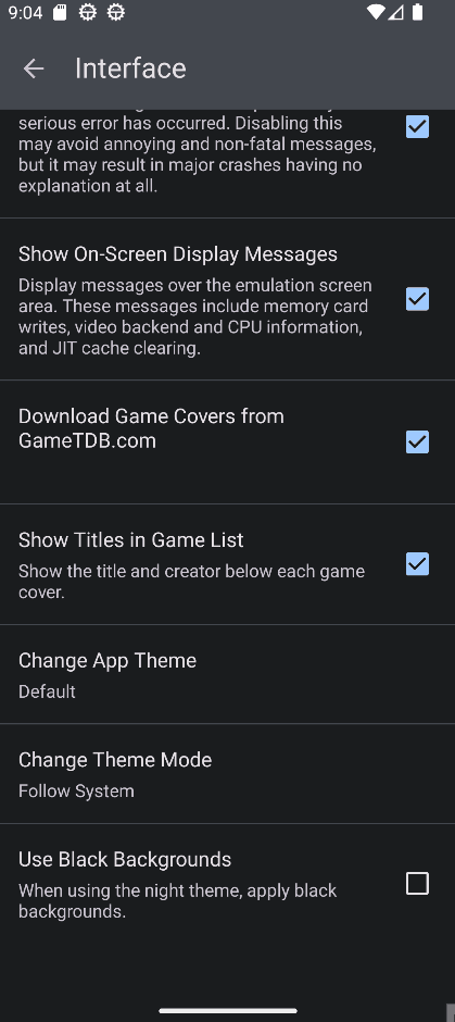 At first glance it feels a little weird to have checkmarks then two combopopups (I don't know what they are called but they are basically comboboxes that pop up) then another checkmark. Like, it -feels- like the combopopups should be grouped together, then have the checkmarks. But if you look at what those options do that would be terrible please don't do that. Additional, we do the mixing of combopopups and checkmarks elseswhere, and the placement of these options is good imo, so this is the best layout. LGTM. Hmm, it may help to have a dividing line between the theme controls the rest of the interface tab items, just to help combat the "weird feeling". If you can even do that. But it's not a big deal. Also, glad to see that the black background option actually turns the background black, RGB 0,0,0. You have to watch out for these things on Android now. |