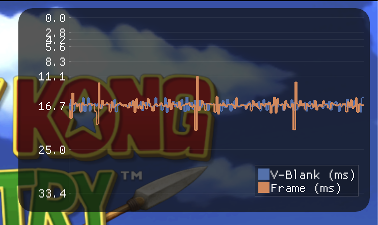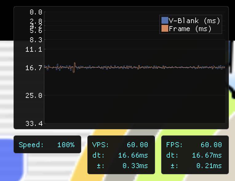 The performance graph looks really useful. It’s a nice addition. I have a question though. I’m running Ventura and I can get the frame pacing locked in through a fixed refresh rate. It’s plainly visible if the pacing is off through the 240 test suite drop shadow test. If it doubles up frames, there’s a visible discontinuity. No games flickers frames like this but it’s only to show how well paced it is. In the following video, Metal performance hud is enabled to show that I have my refresh rate set to 59.94Hz with good pacing. My question is about the numbers reported. It would make sense for the V-Blank numbers to match the display refresh rate since I can visually confirm that the pacing is perfect. pacing.movPerfect pacing to will also depend on your video viewer of course. You can confirm the video is valid by stepping through each frame. Is the mismatch due to some weirdness within Dolphin or the sampling code for getting the numbers? It doesn’t seem accurate. |