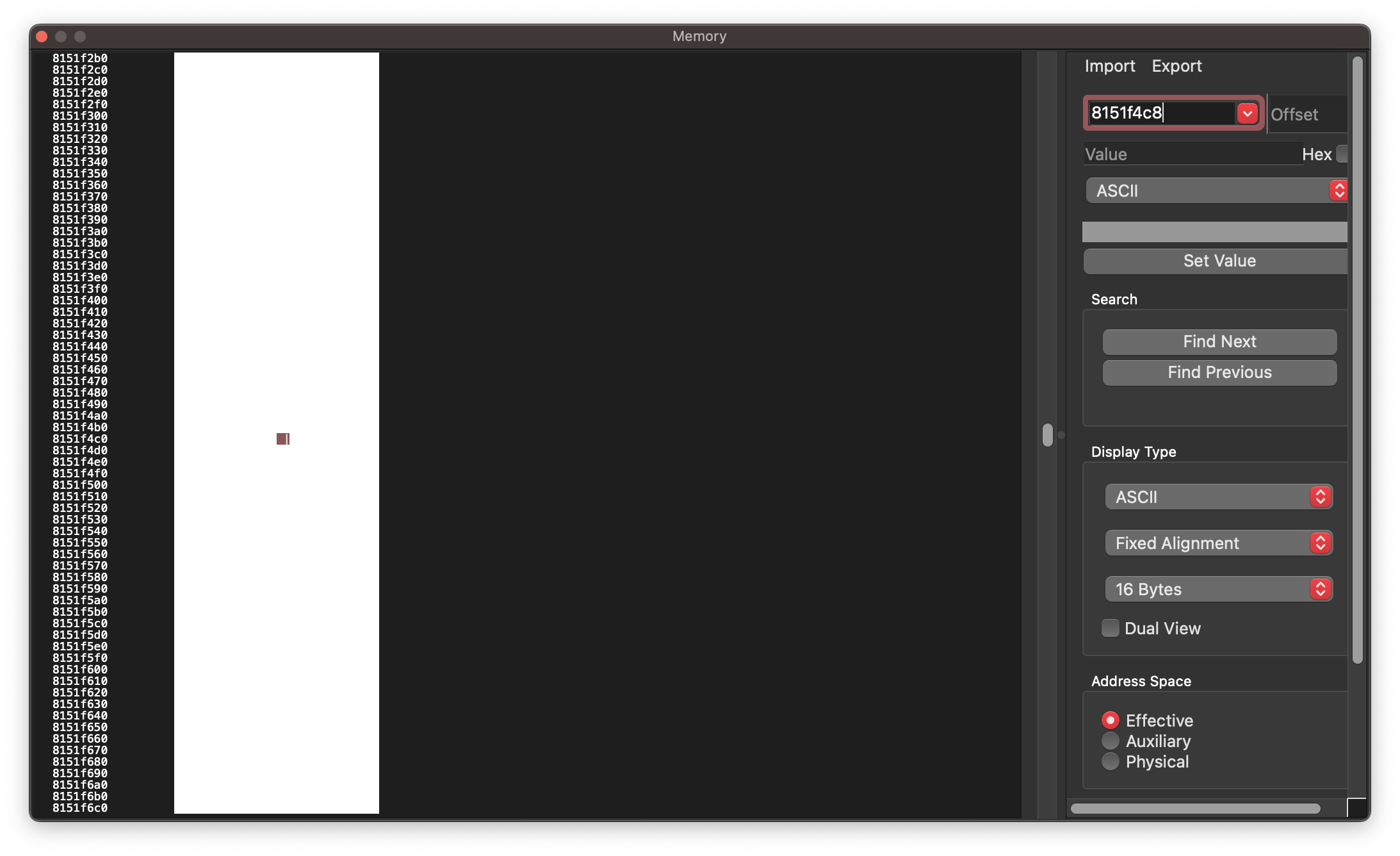 In commit 6f4f4e0 on line 552, the background of the memory viewer was filled to be white. In dark mode this would make it impossible to see the contents of the viewer.