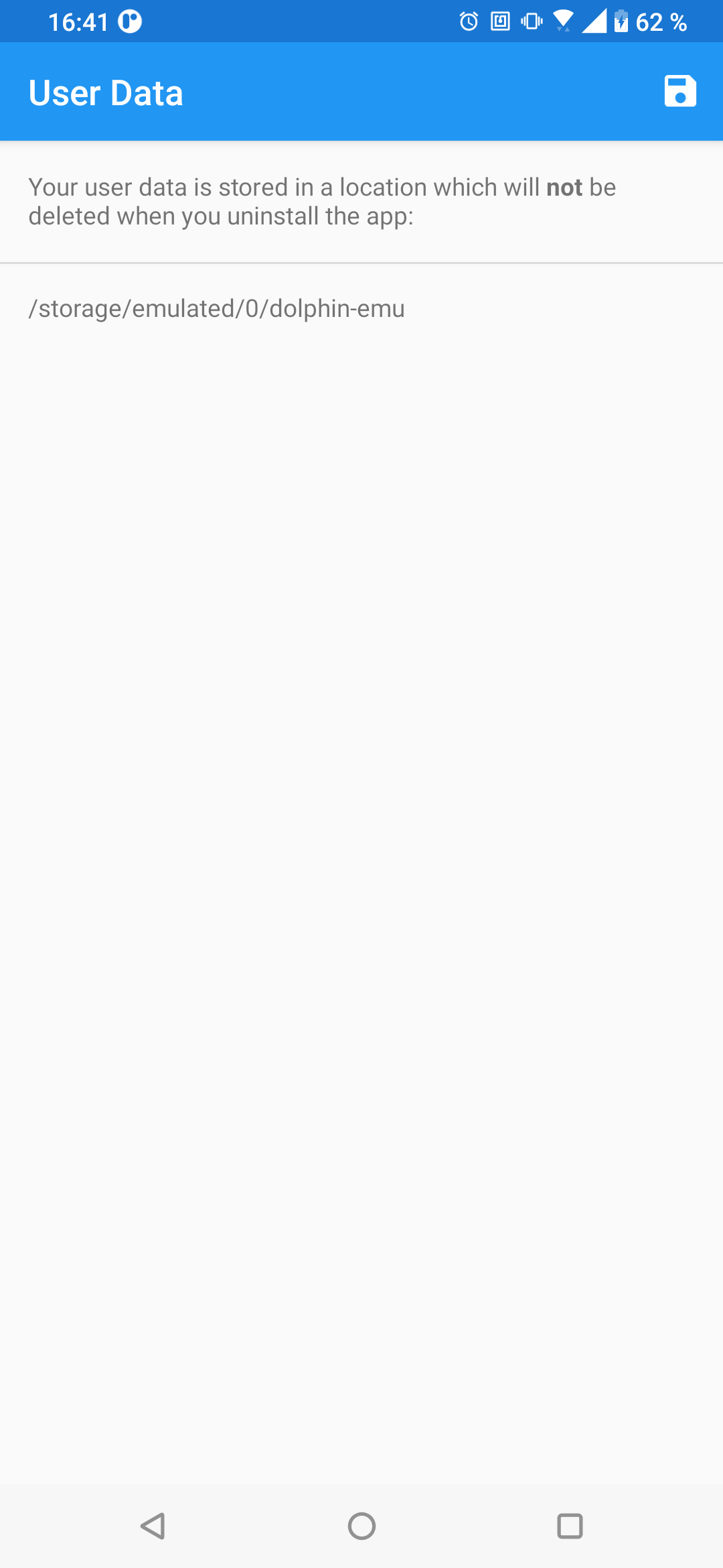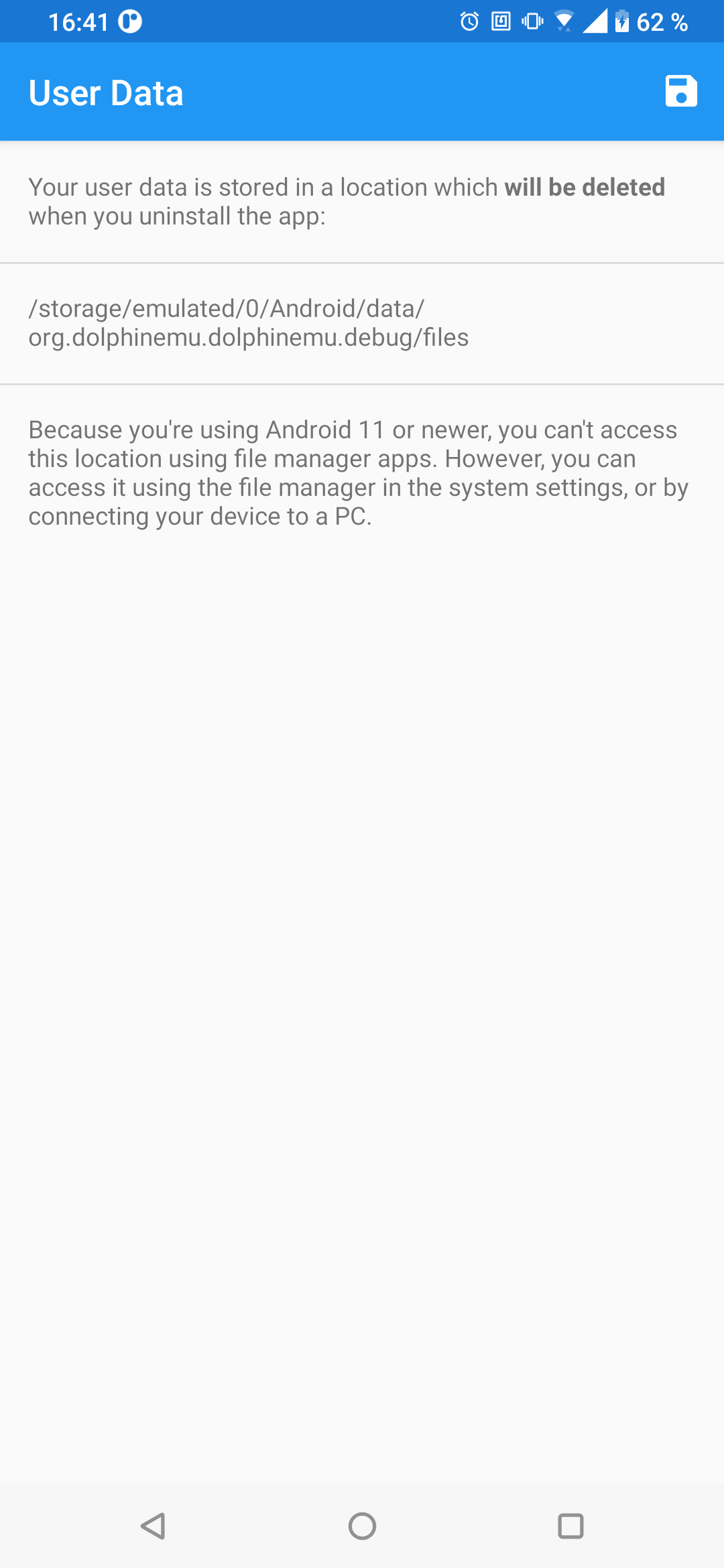 dolphin-emu. With scoped storage, we will not be able to access any location other than the app-specific directory created for us by Android unless we use the Storage Access Framework, and making our C++ code support the Storage Access Framework for everything stored in the user directory (there's a lot of different things handled by different pieces of code in there!) would both be a very big undertaking and would likely lead to severe performance problems in some situations. So we will have to use the app-specific directory as the user directory. Even if we could use the Storage Access Framework, the app-specific directory would have to be the default directory anyway unless we want to force the user to pick a directory before they can start using the app.(To be clear, each app has one app-specific directory in internal storage and one app-specific directory in external storage. All my mentions of "the app-specific directory" refer to the one in external storage – we don't want to use the internal one because it has the huge drawback of not being user accessible.)