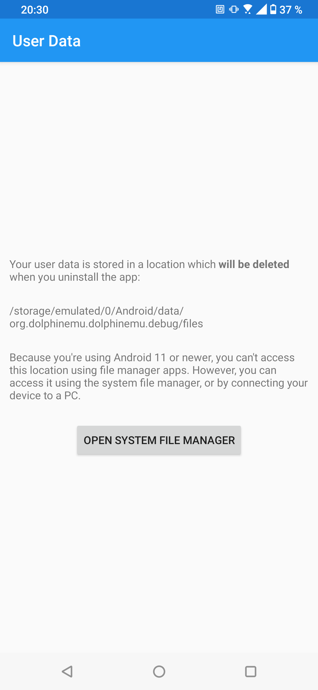 About the "User Data" menu, it would be nice if a link to directly launch the system file manager could be added to that screen when using scoped storage. I haven't thoroughly investigated this but the system file manager seems to always use the same package name ( |