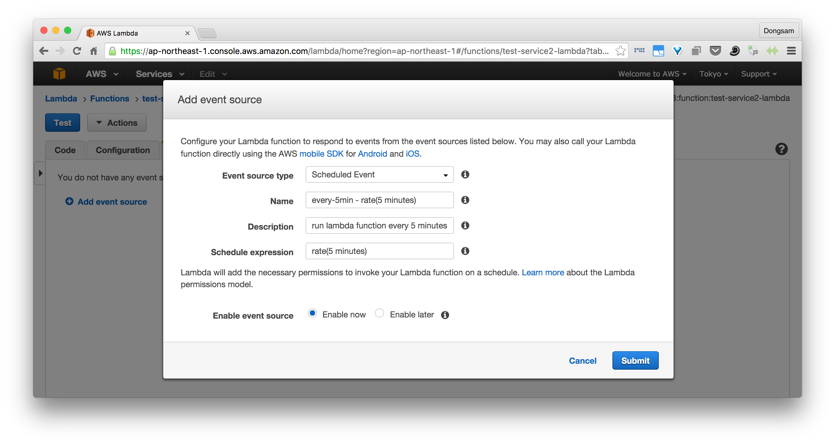 - Event source type 을 Scheduled Event 로 설정하여 5분 주기 등 cron 처럼 설정 가능
