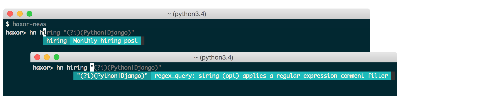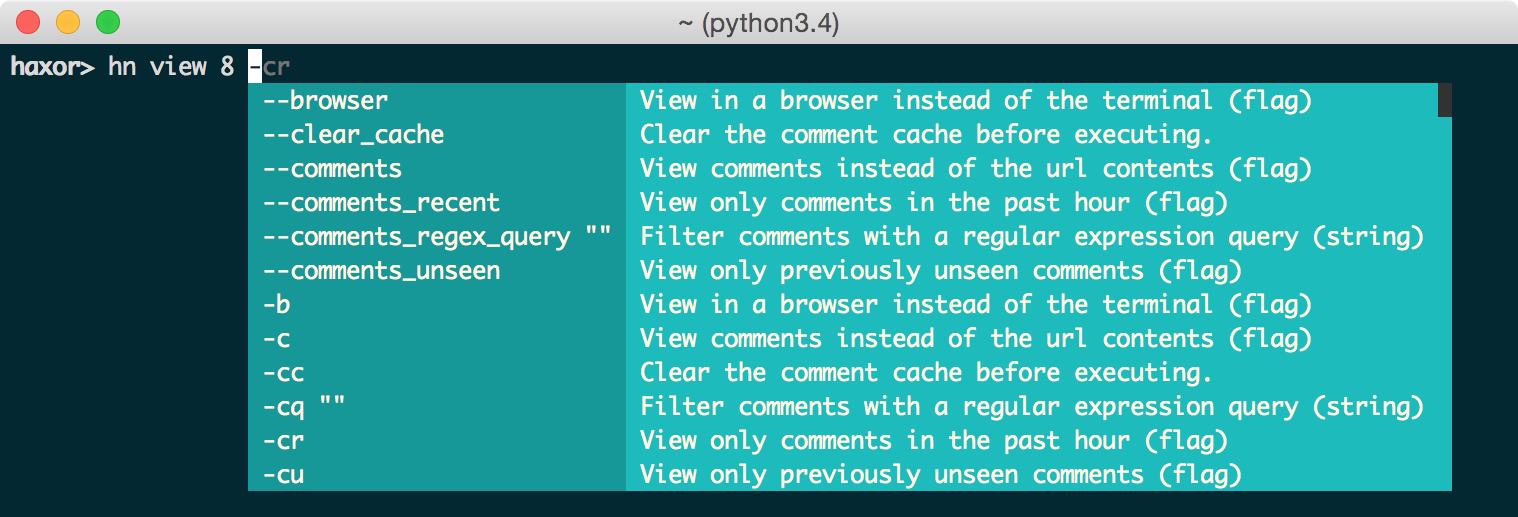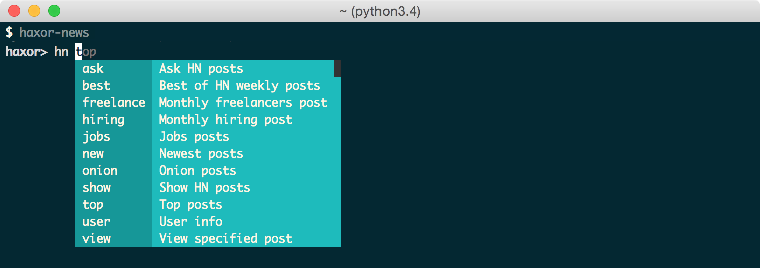 haxor-news comes with a handy optional auto-completer with interactive help: