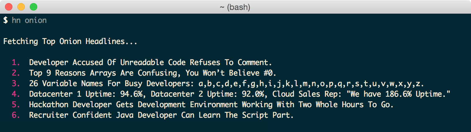 $ hn onion [limit] # post limit default: all
