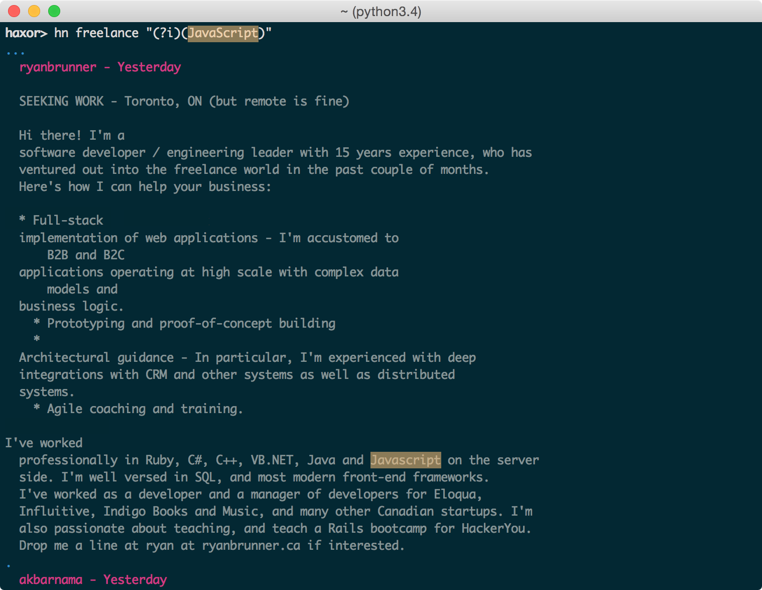 $ hn freelance "(?i)(Node|JavaScript).*(remote)" > remote_jobs.txt