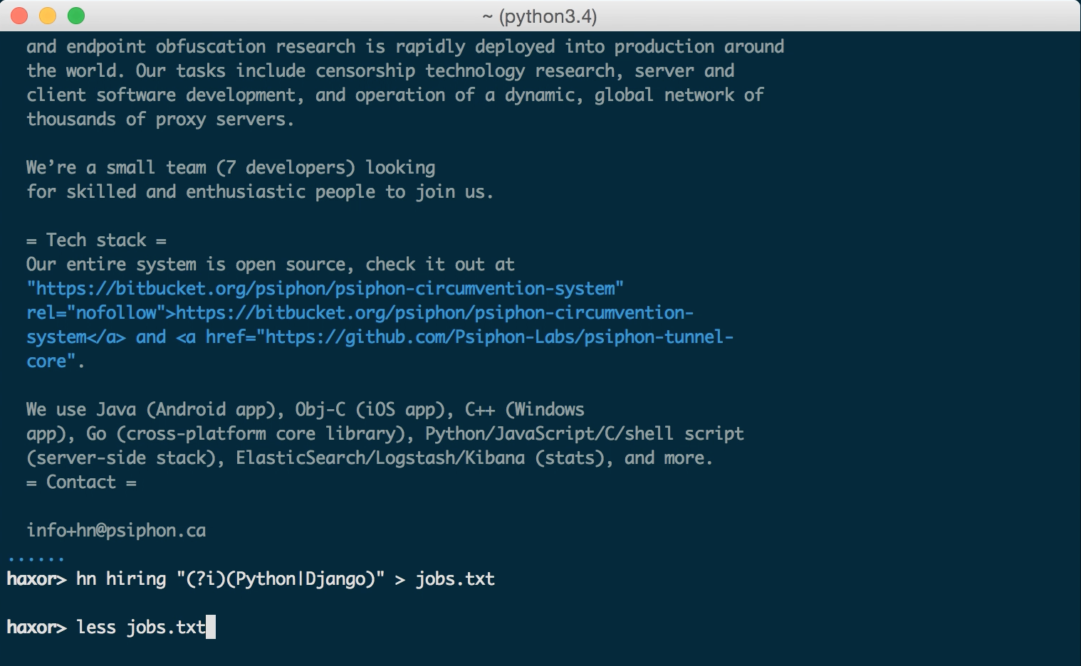 $ hn hiring "(?i)(Node|JavaScript).*(remote)" > remote_jobs.txt