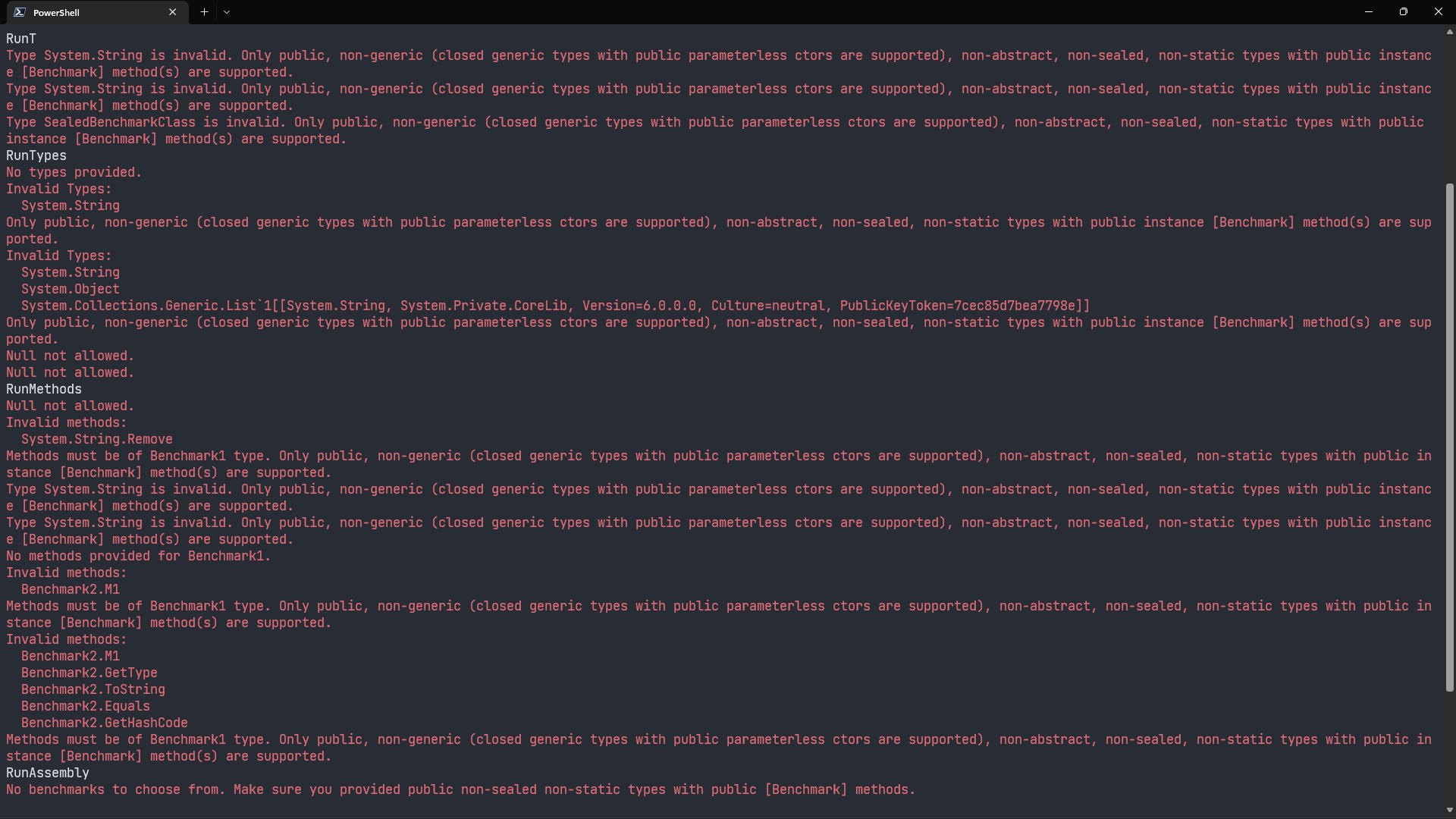 RunTypes(new Type[] { null, typeof(Benchmark1) });Master args=null:Master args=emptyPRRunTypeMethods == BenchmarkRunner.Run(Type, MethodInfo[]);MethodInfo strMethod = typeof(string).GetMethods().First(m => m.Name == "Remove");