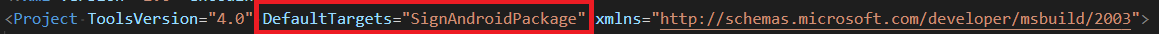 - Edit the .csproj file and change the "DefaultTargets" to "SignAndroidPackage" instead of "Build".