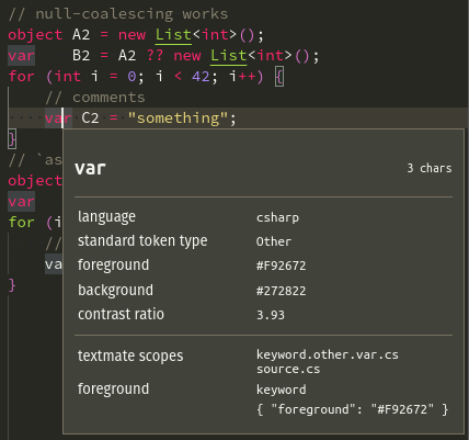 ## Details Visual Studio Code 1.69.2 The problem has been observed in multiple themes, including Monokai. ## Repro Chaining the `as` keyword and the null-coalescing operator in a single line breaks tokenizing on following lines. For example; ```csharp var a = b as float[] ?? new float[]; ``` Note the last of the three examples, how the `for` is green instead of red, and `var C3` is white.  Inspecting the token scope shows that `var C2` and `var C3` are being parsed differently.   It's worth noting that I do have ms-dotnettools.csharp version 1.25.0 installed. The above screenshots were taken with the extension disabled.