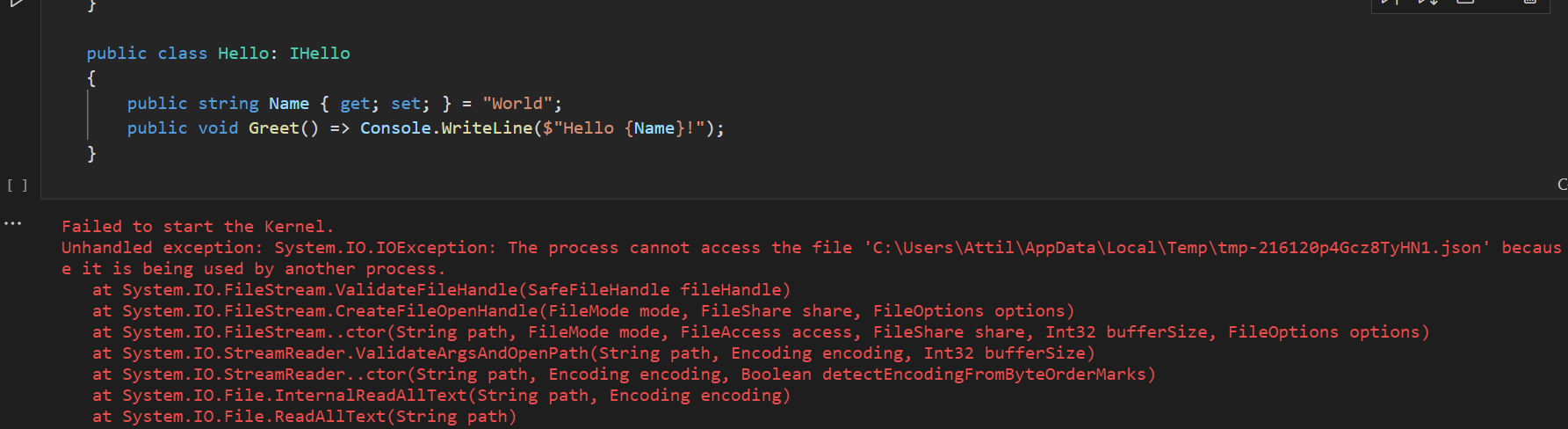 Unhandled exception: System.IO.IOException: The process cannot access the file 'C:\Users\Attil\AppData\Local\Temp\tmp-21612ZwKCA2x9U7M5.json' because it is being used by another process.