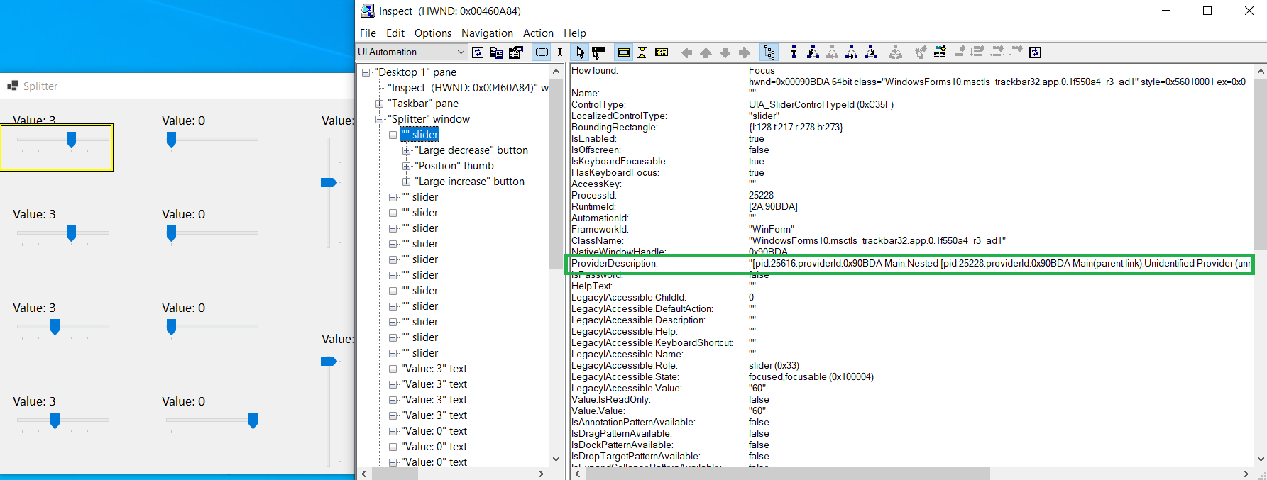 ProviderDescription: "[pid:9884,providerId:0x280FE0 Main:Nested [pid:28360,providerId:0x280FE0 Main(parent link):Microsoft: MSAA Proxy (unmanaged:UIAutomationCore.dll)]; Nonclient:Microsoft: Non-Client Proxy (unmanaged:uiautomationcore.dll); Hwnd(parent link):Microsoft: HWND Proxy (unmanaged:uiautomationcore.dll)]"After fix: