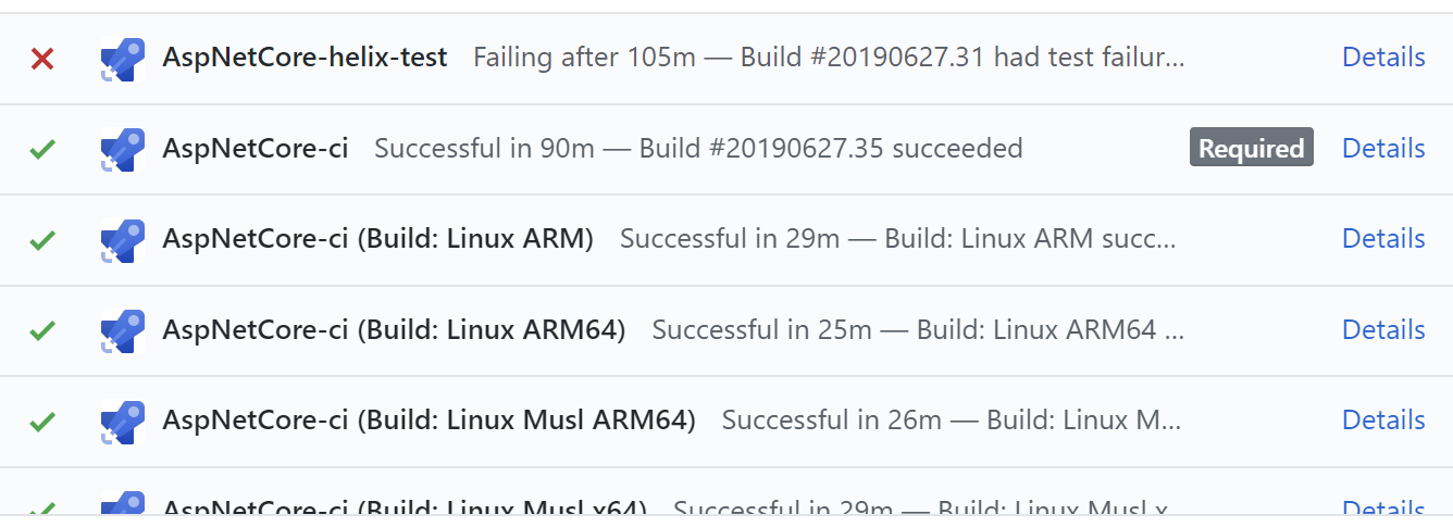 I spent looking around to see what others are doing. Here is what AspNet looks like (e.g. dotnet/aspnetcore#11660). Only their main CI pipeline is marked as required: CoreClr is likewise splitting their PR builds into multiple pipelines, with several dedicated to testing (e.g., dotnet/coreclr#25350). None of the pipelines are marked as required (maybe not the setting we want), and the PR-merge history suggests that merging PR's with less-than-perfect pass-rate is the norm. There are others that use only 1 pipeline (for e.g., MSBuild which is closer to us - averaging 34 mins, which includes testing. I suspect msbuild can run tests safely on the build-box...) Overall, I like AspNet's approach. |