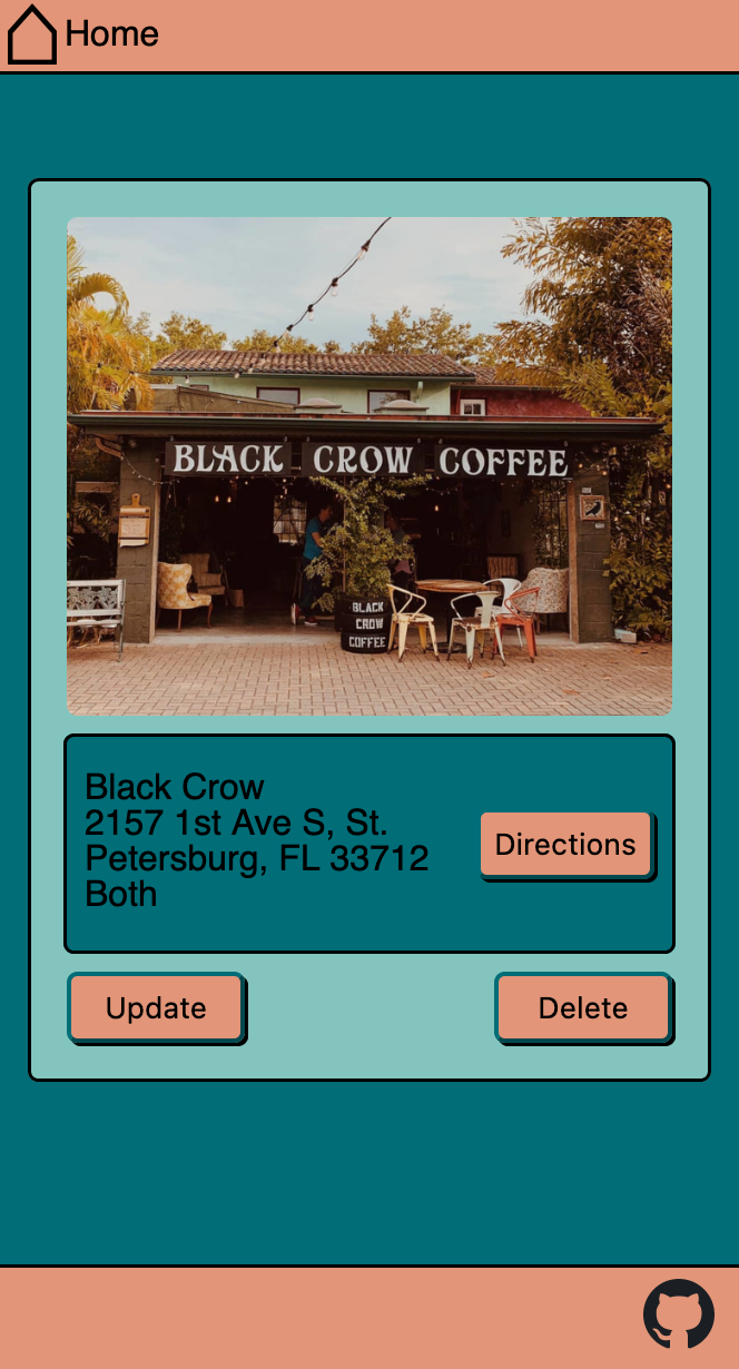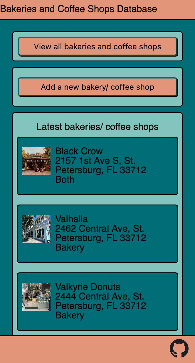 This is a full stack app that lets users create, read, update, and delete coffee shops and bakeries in a database. Users are able to add storefront photos and get directions to each entry.