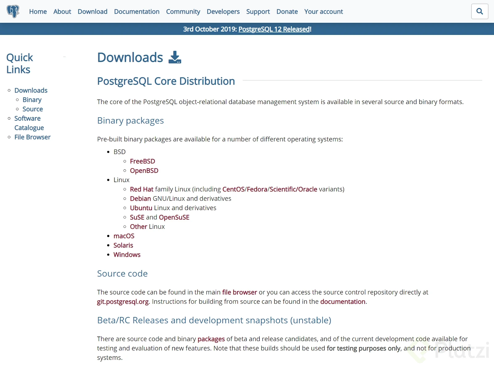 Es altamente recomendable seleccionar la penúltima o antepenúltima versión. Si bien la última versión estable está disponible, en éste caso la 12.0, no es recomendable instalarla en nuestro equipo, ya que al momento de instalarla o usar un servicio en la Nube para Postgres, lo más seguro es que no esté disponible y sólo esté hasta la versión 11.5, que no es la última versión. Esto porque todos los proveedores de Infraestructura no disponen de la versión de Postgres más actual siempre (tardan un poco en apropiar los nuevos lanzamientos).