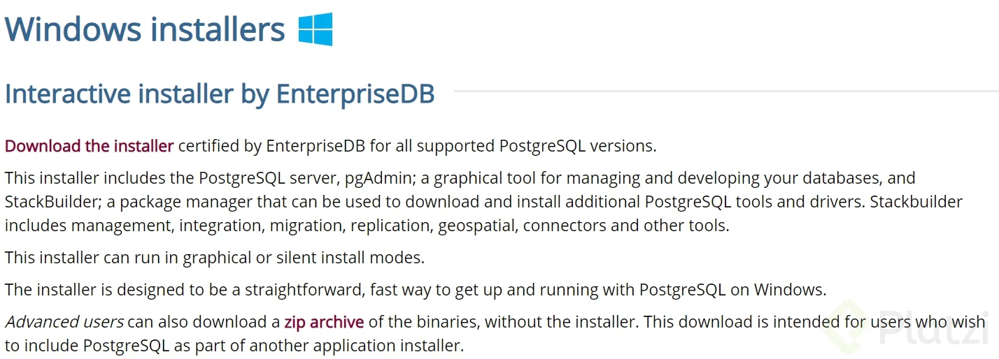 Haz clic en el enlace “Download the installer”. Esto nos va a llevar a la Web de Enterprise DB o EDB. EDB es una empresa que ofrece servicios sobre el motor de base de datos PostgreSQL y ofrece un instalador para Postgres de manera gratuita.