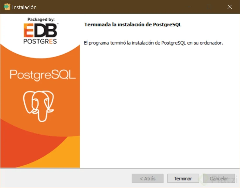 Una vez terminada la instalación, aparecerá en pantalla un mensaje mostrando que PostgreSQL ha sido instalado correctamente.