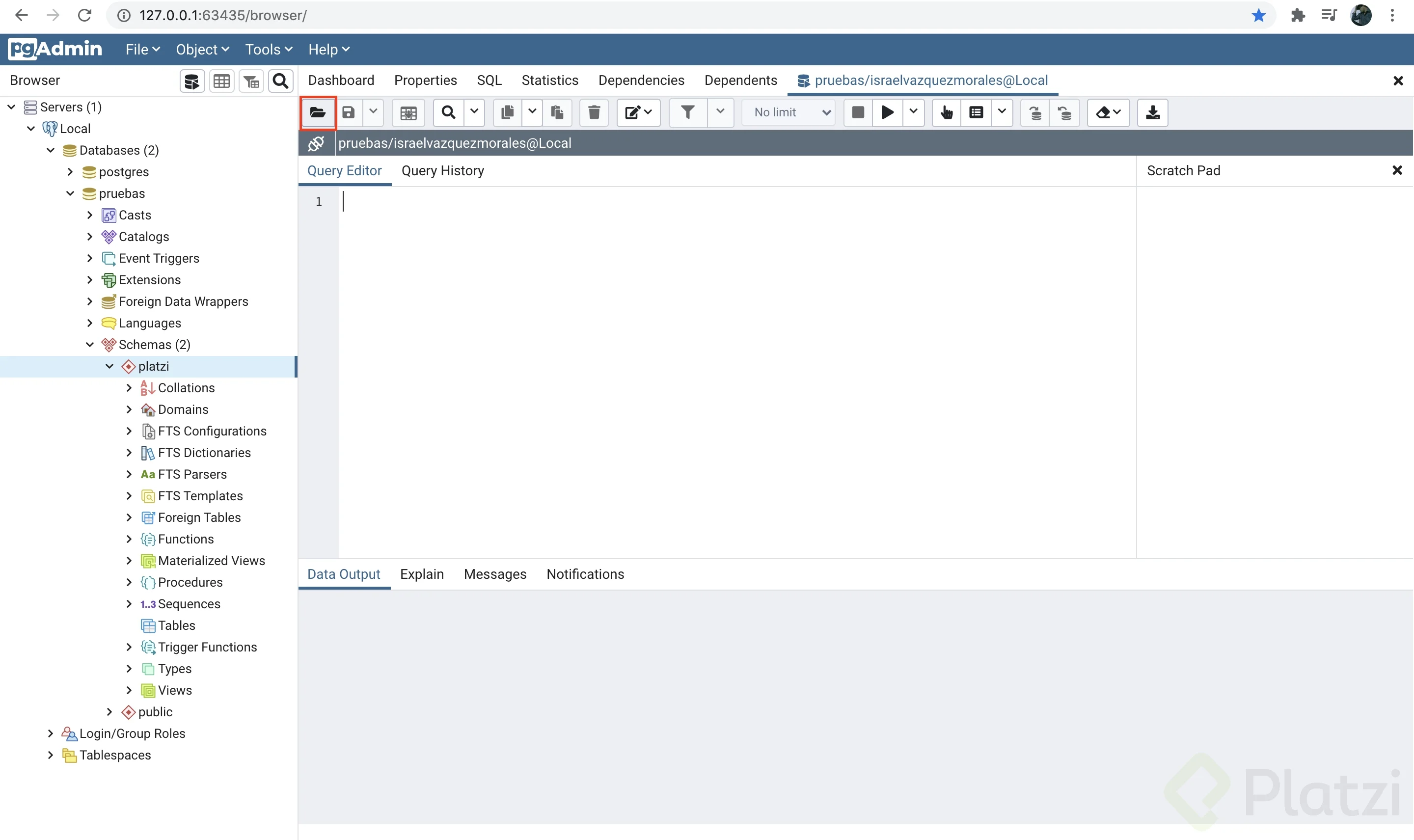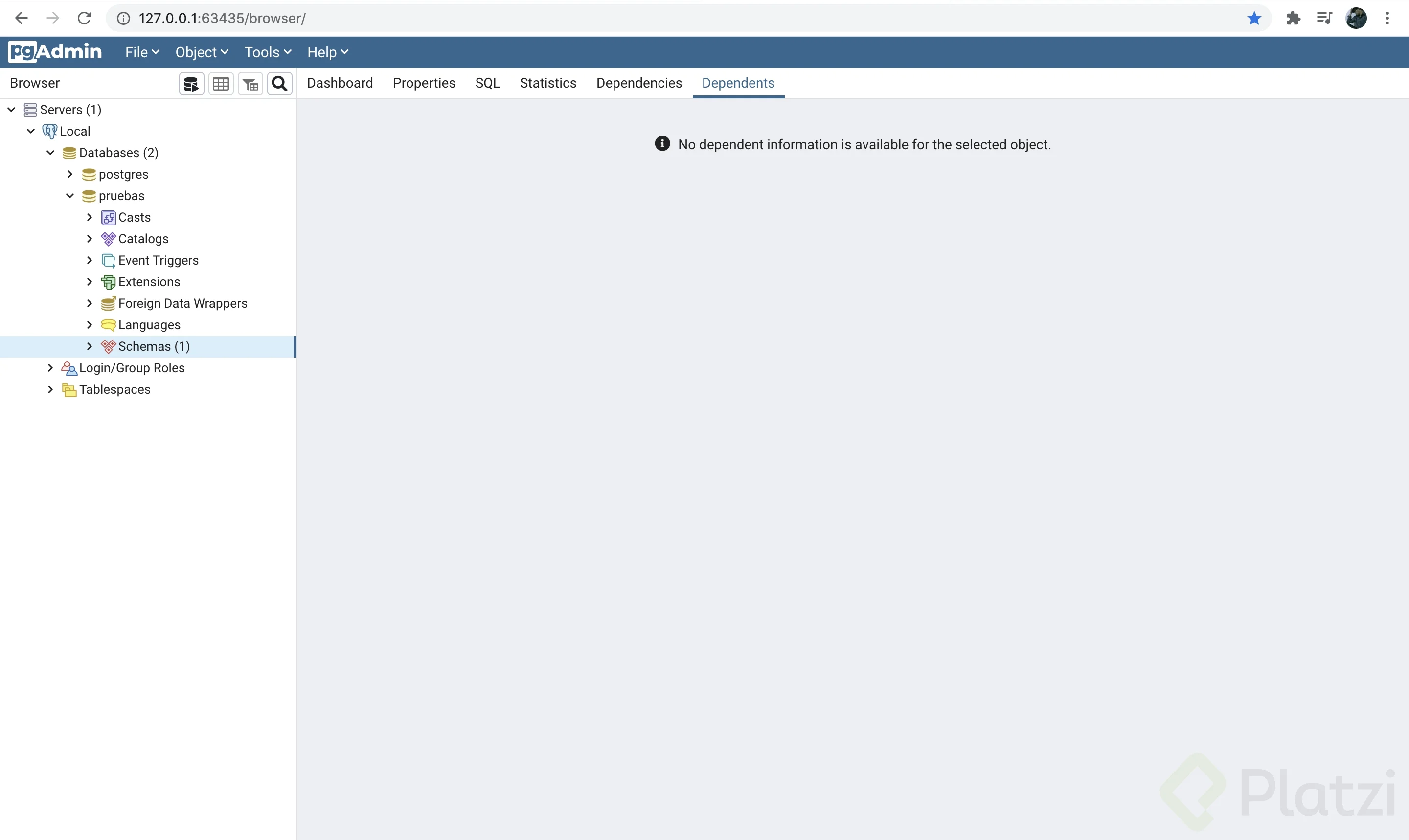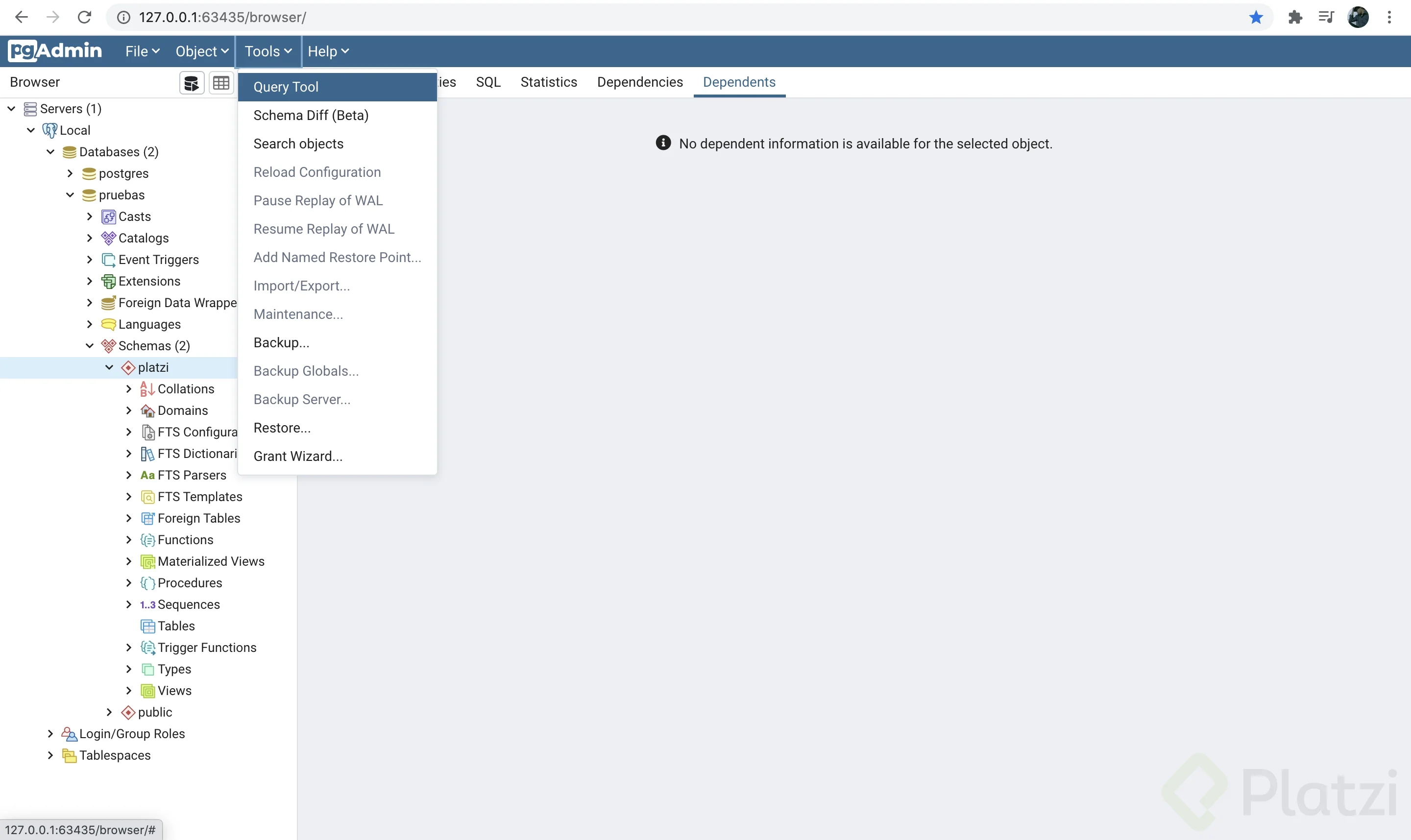 Para hacerlo abre pgAdmin (normalmente está en la dirección: http://127.0.0.1:63435/browser/), y expande el panel correspondiente a tu base de datos, en mi caso la he nombrado “prueba”.