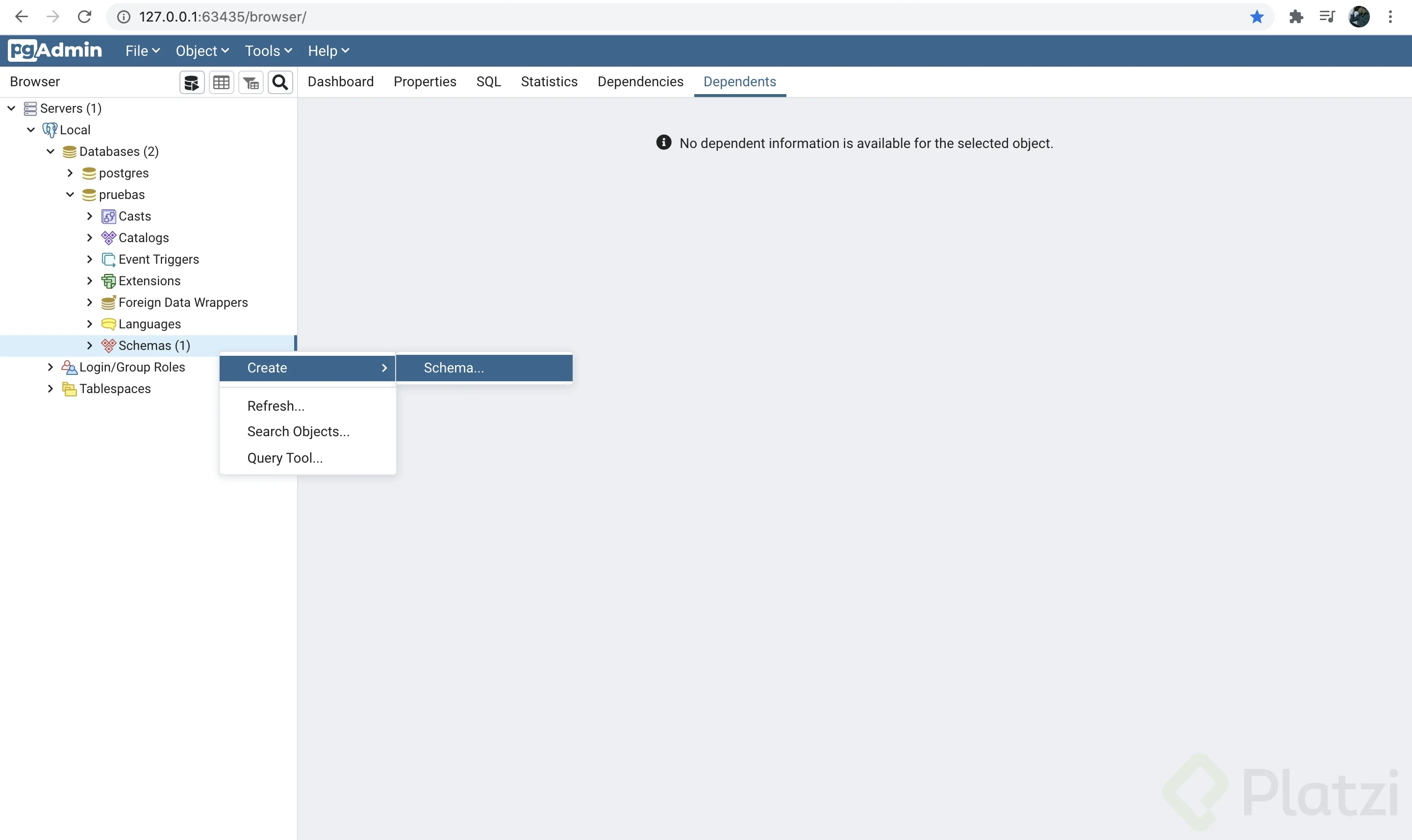 Al seleccionar la opción abrirá un cuadro de diálogo en donde debes escribir el nombre del esquema, en este caso será “platzi”. Si eliges un nombre distinto, asegúrate de seguir los ejemplos en el curso con el nombre elegido; por ejemplo si en el curso mencionamos la sentencia: