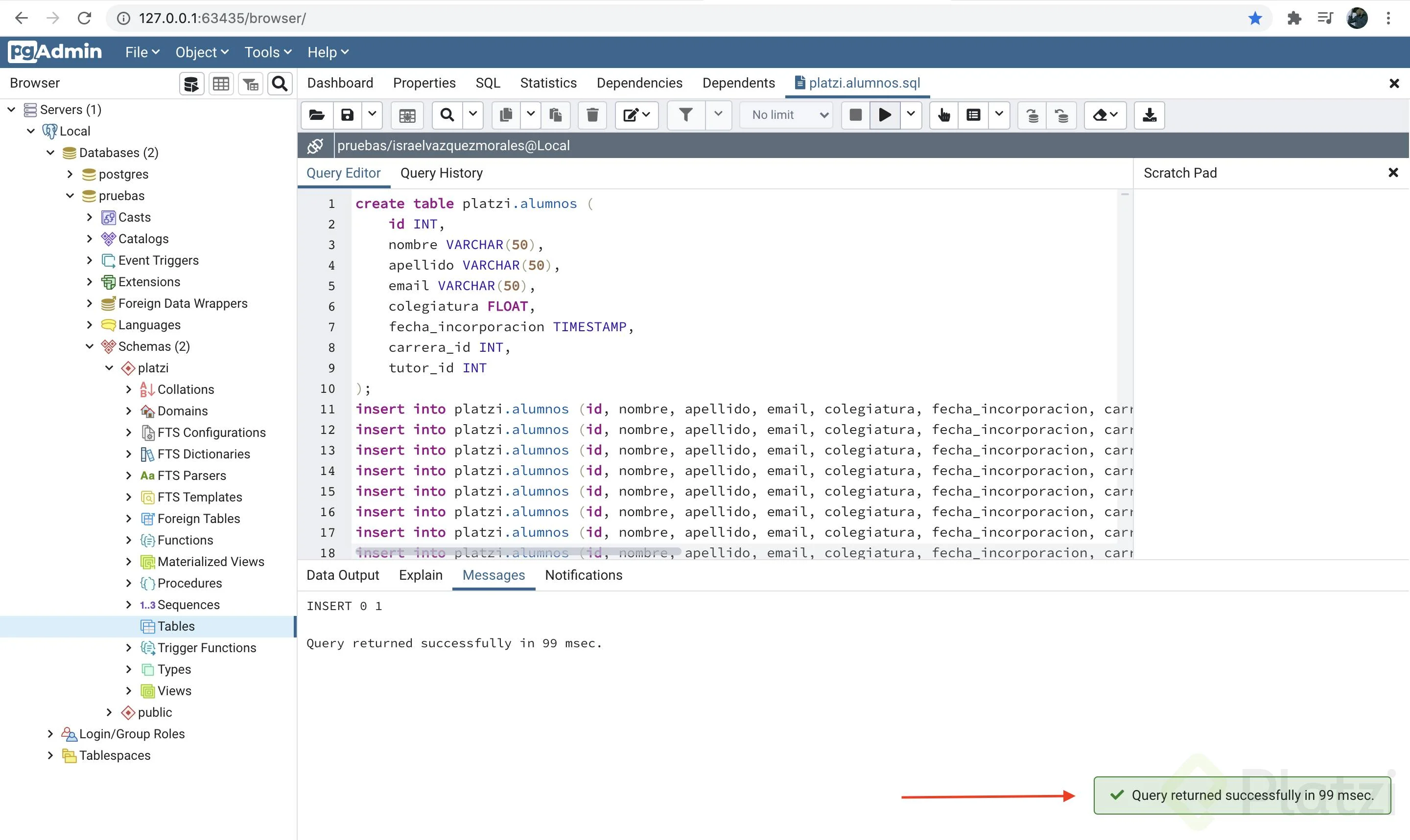 Revisa que tu esquema se haya generado de manera correcta recargando la página y expandiendo el panel Schemas en tu base de datos.