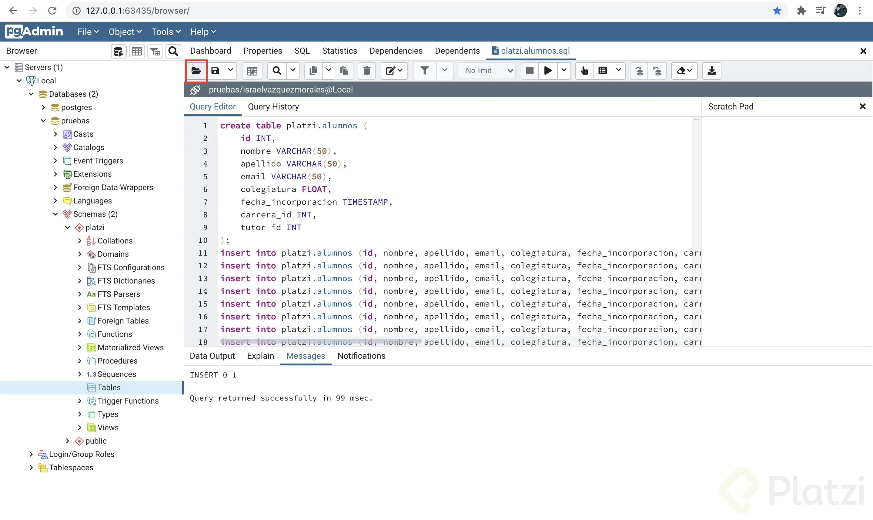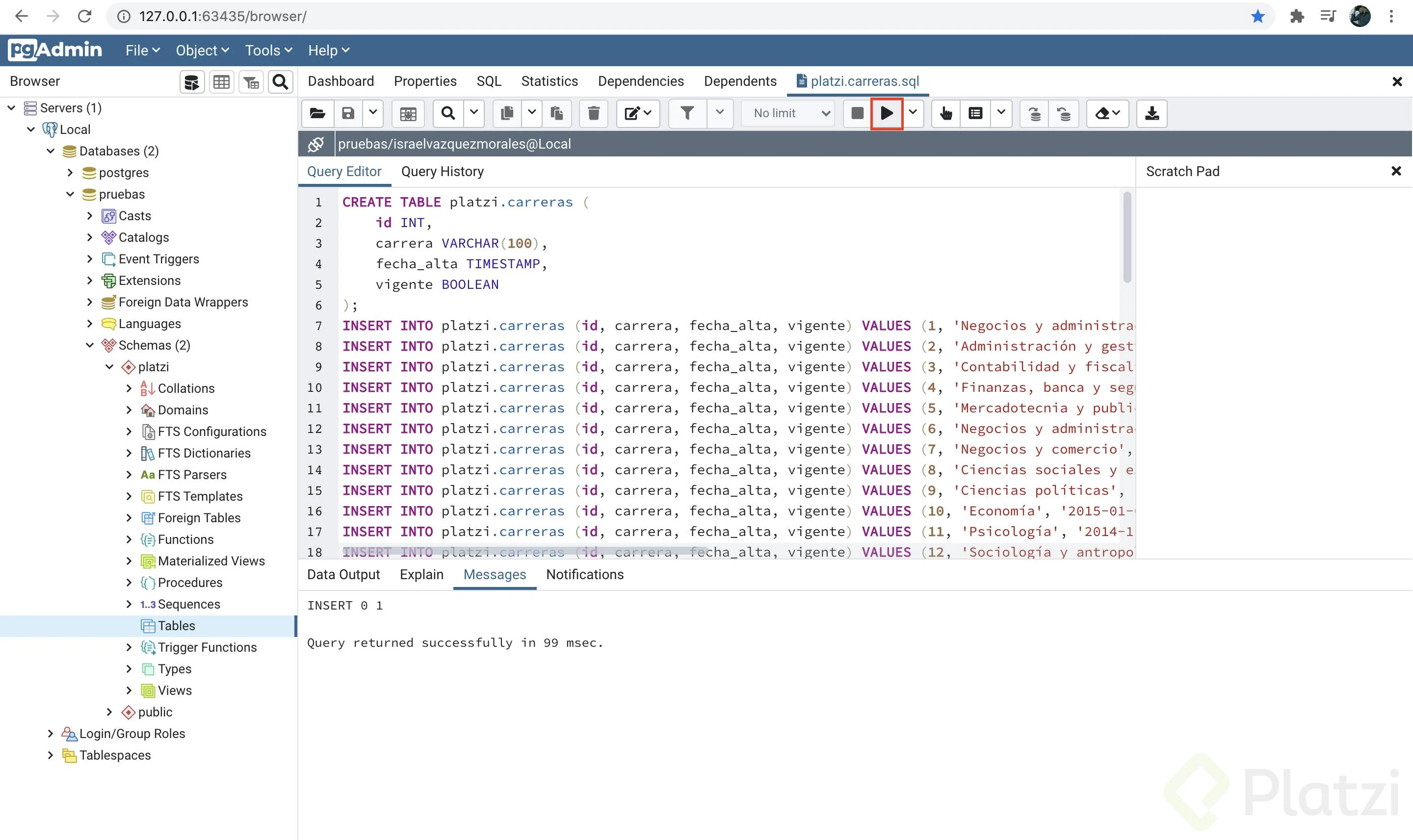 Ahora repetiremos el proceso para la tabla platzi.carreras