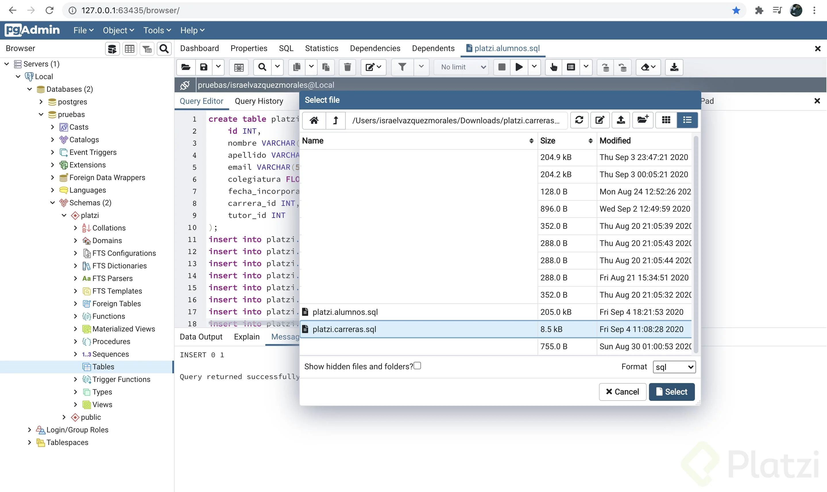 Busca en tus archivos y selecciona el archivo platzi.alumnos.sql que descargaste de este curso, da click en el botón “Select”.