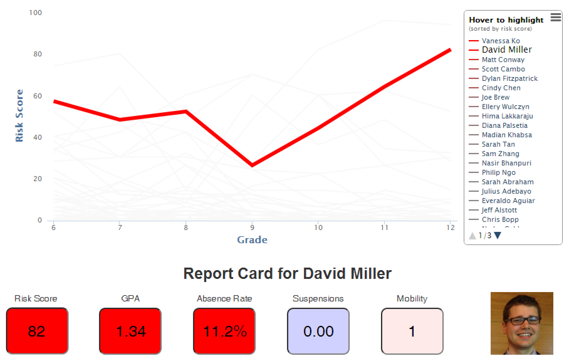 The main goals of this project were to both: (i) generate accurate predictions and (ii) present the predictions through an actionable interface. Thus, a large amount of our efforts went into the design and implementation of a web-based tool that can be used by school administrators and counselors to track the risk scores of their students over time, allowing them to easily identify students that are in need of personal attention.