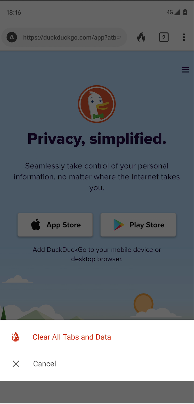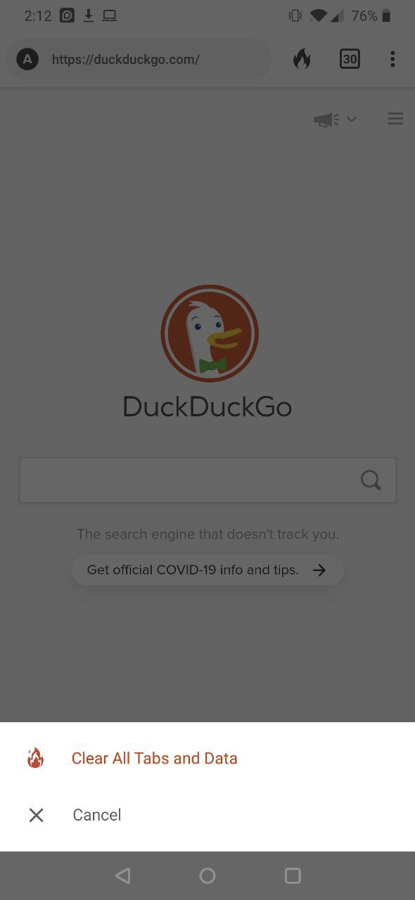 After clicking on fire button, a bottom dialog appears to request user confirmation to clear all tabs and data.