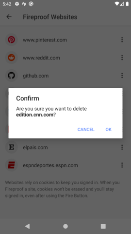 Currently, we show a confirmation dialog when a user deletes a bookmark or deletes a fireproof website. See attached screenshot