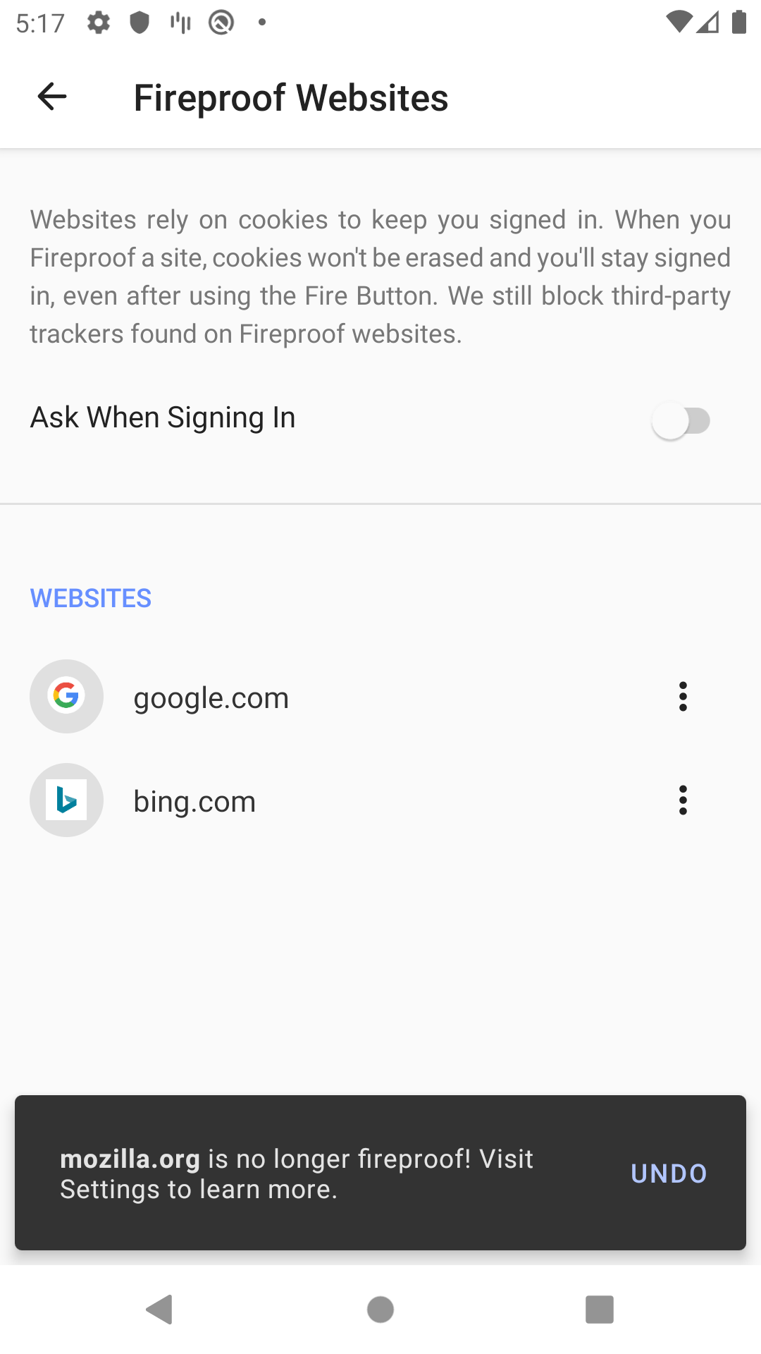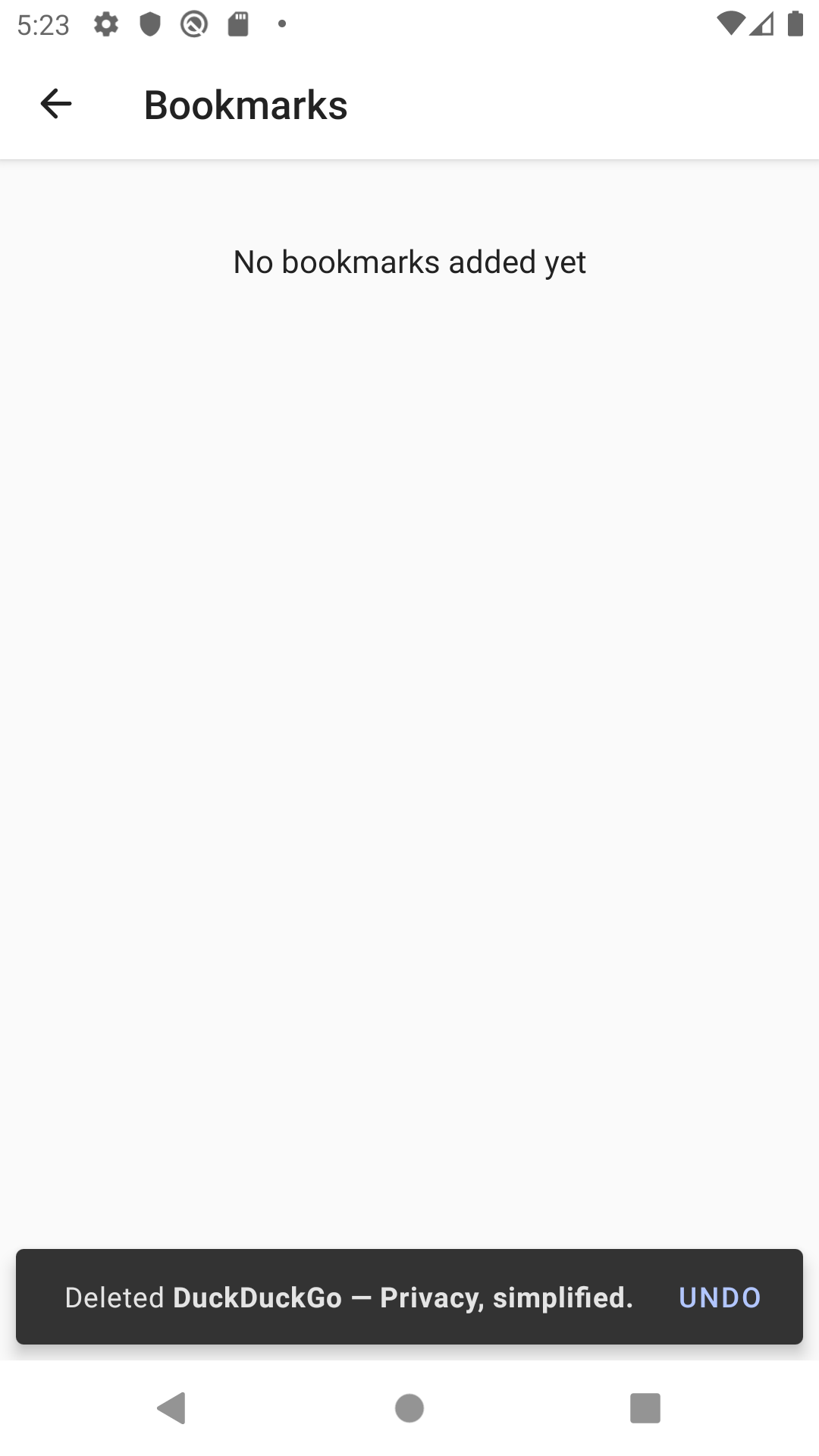 I have a added a snackbar when user deletes a bookmark or fireproof website.The snackbar contains a undo option which can be used to cancel the deletion.I have used string resources instead of hardcoded string .