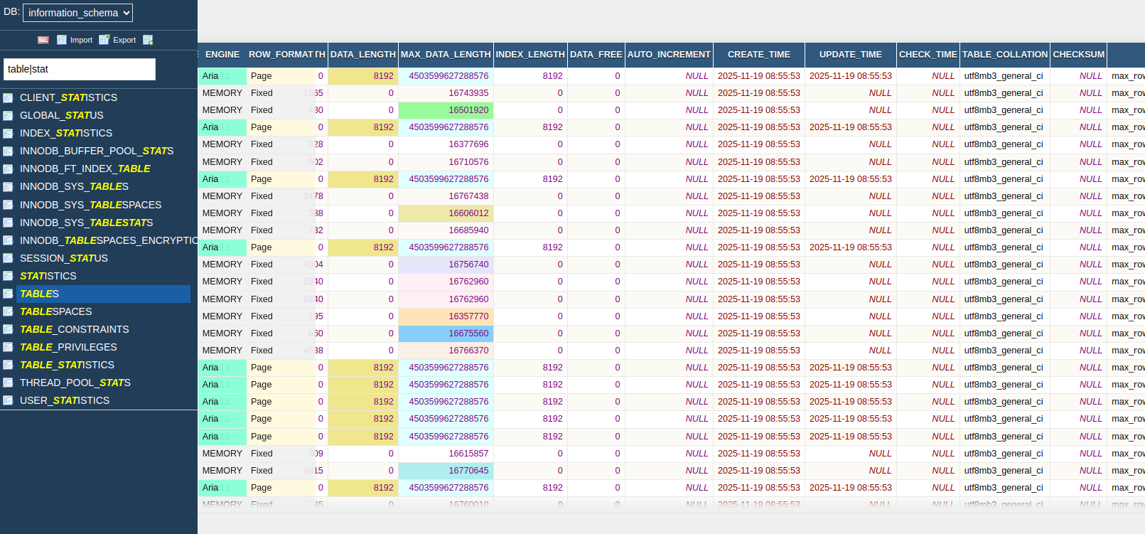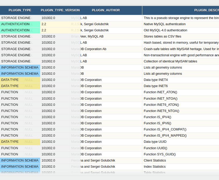 tables-filter-regex.php: Filter table names with regex (for each selected database), much faster than the plugin tables-filter in Adminerhidden-and-sticky-columns.php: Use ctrl+alt+click on column header to hide a column and alt+click to make it stickymark-repeated-values.php: Use alt+click to highlight the same values in other cells of a column (up to 20 colors)color-for-column-type.php: Show different color for each column type (number, datetime, enum ...)name-from-referenced-row.php: Display the first char/varchar/enum column from the table referenced by a foreign key