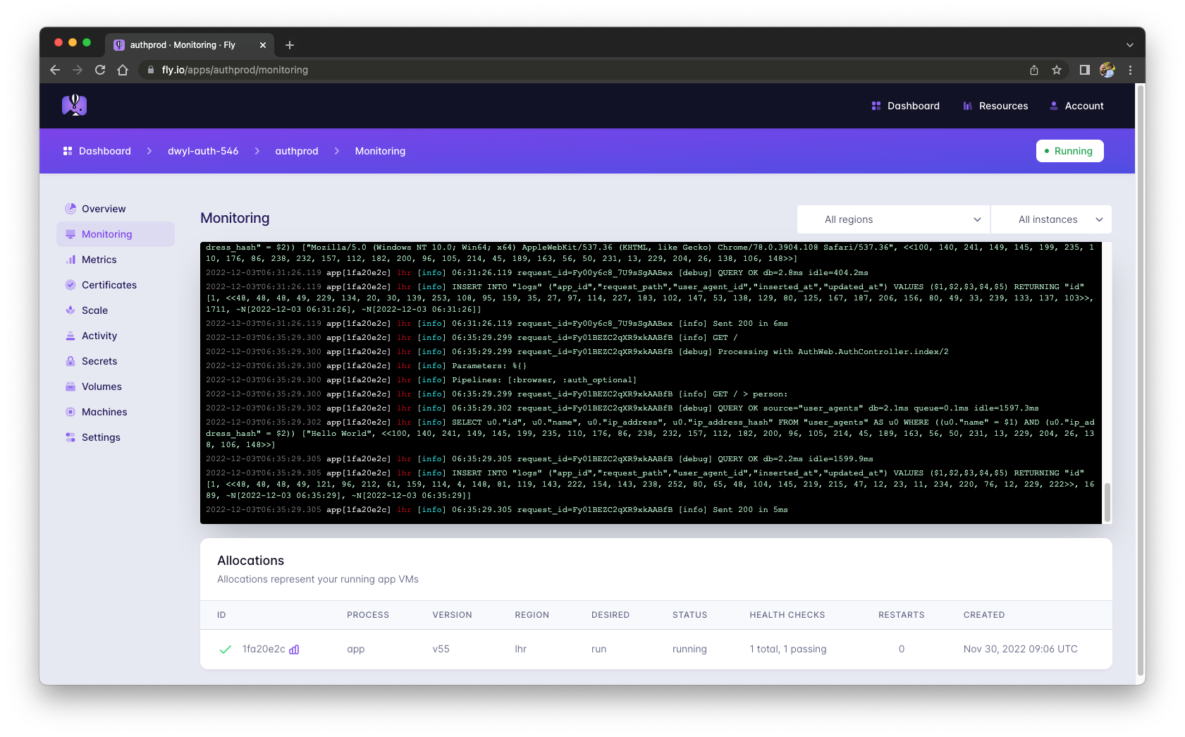 At present the Fly.io logging is very basic. e.g: https://fly.io/apps/authprod/monitoring