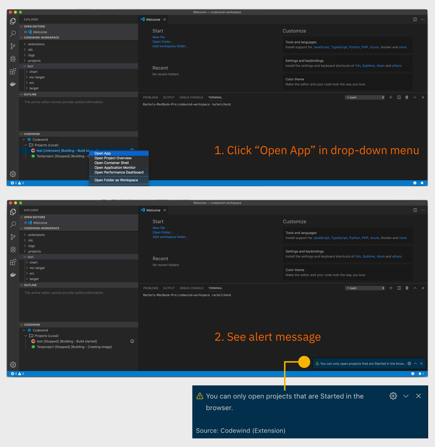 When a user tries to open app in the browser while the app is still building, the alert message says "You can only open projects that are Started in the browser." Two users were confused by this message, because A) it's unclear that "Started" refers to application status, and B) the message doesn't tell the user what to do in order to continue.